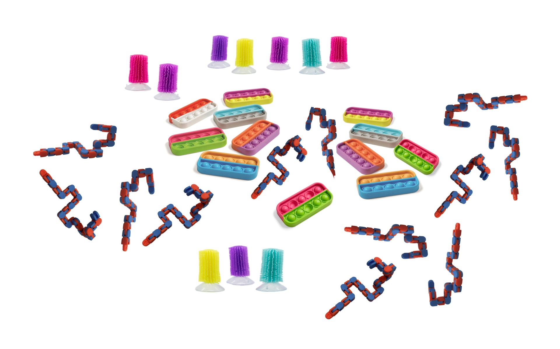 20 delar. För barn som vill pilla på något för att få ro och kunna koncentrera sig. Innehåller: 3 olika tangles, 3 stressbollar, 1 kooshboll, ett armband och 12 känslohanteringstenar. Lägg allt i en fin korg och ställ tillgängligt för alla i klassrummet. Olika färger förekommer. PVC-fri.