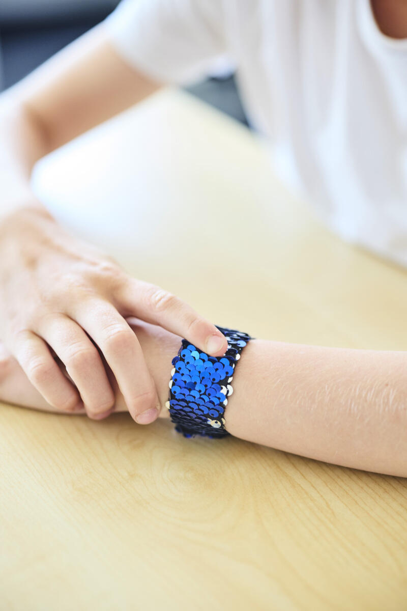 Set med 6 snäpparmband, täckta med paljetter för en extra fidget-upplevelse. Slå dem över handleden och bandet sveper runt, skapa sedan mönster eller stryk över och bandet byter färg. Mått: 21x3 cm.