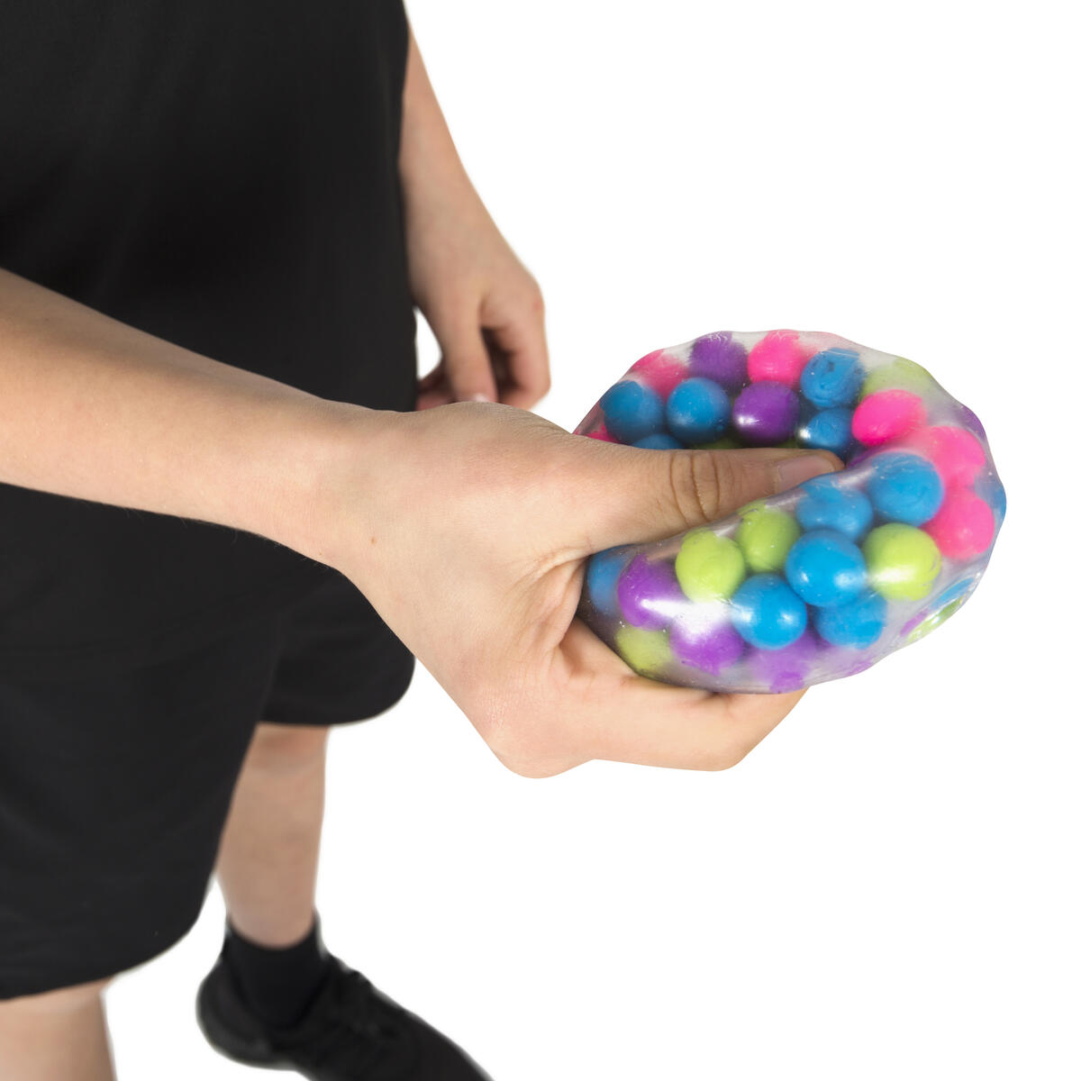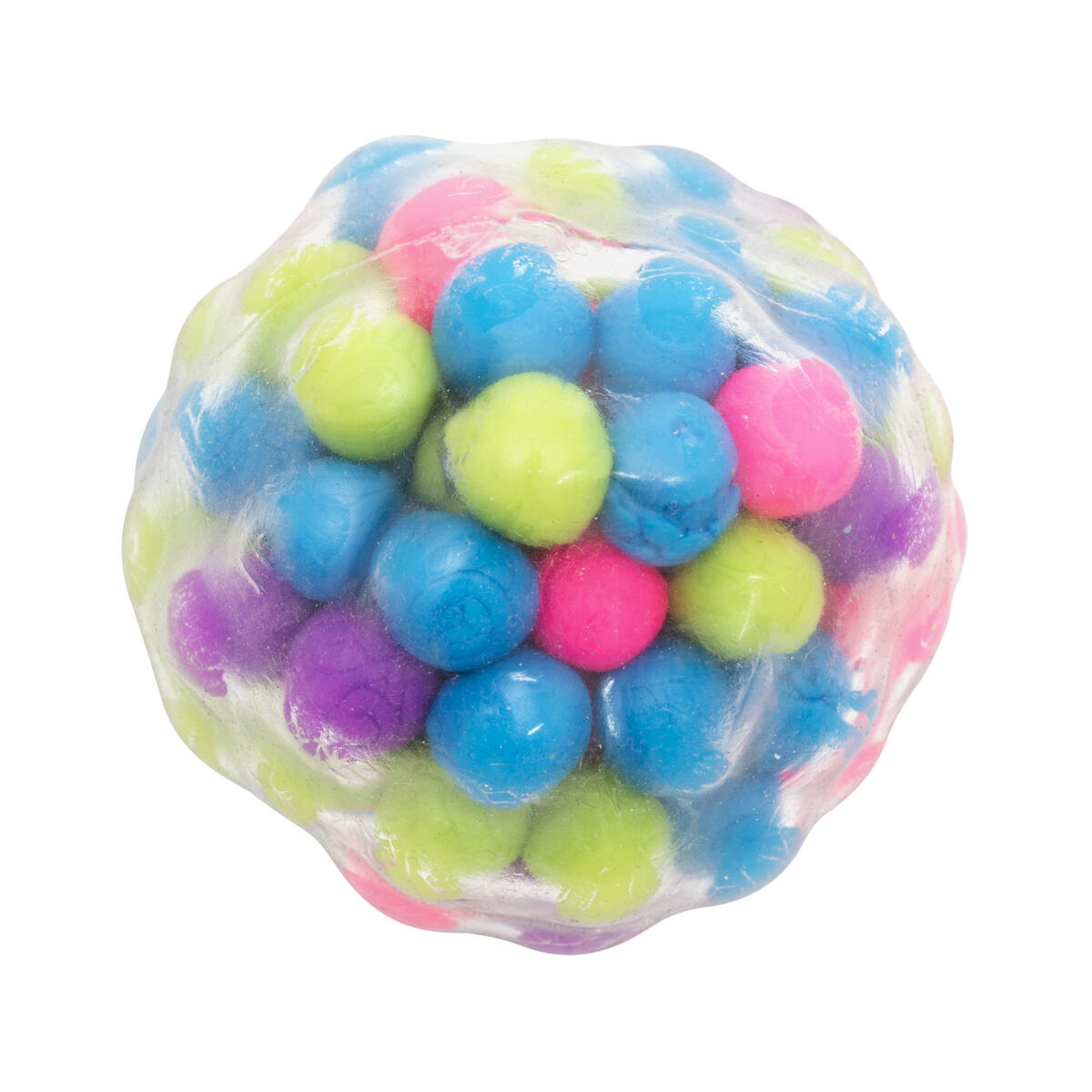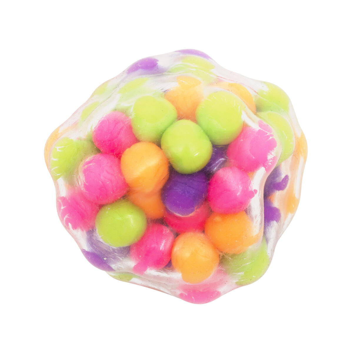 En lugnande stressboll som passar perfekt i handen. Den är fylld med små, mjuka och färgglada gelébollar som rör sig när du klämmer på den. Ytan är genomskinlig och innanför finns mjuka piggar för en extra taktil upplevelse.PVC-fri.