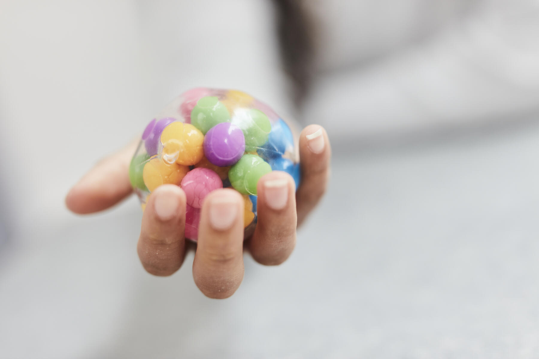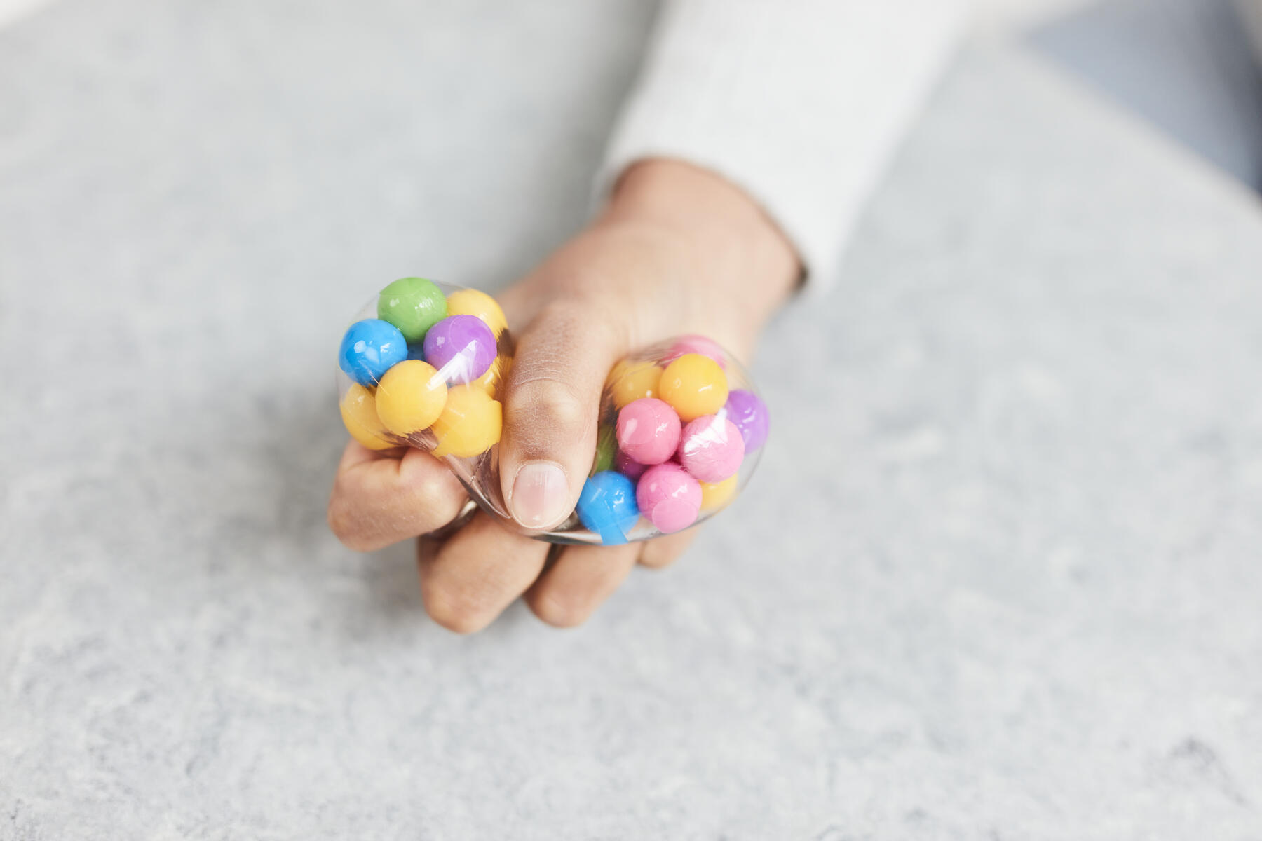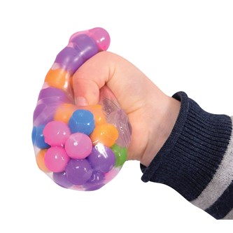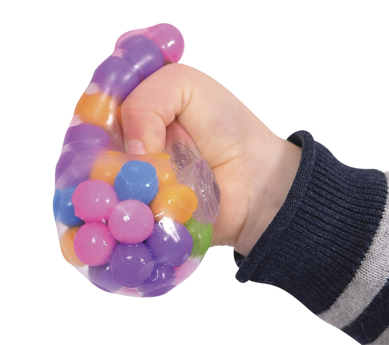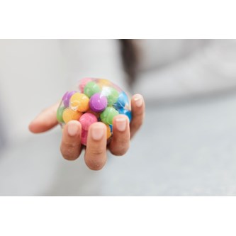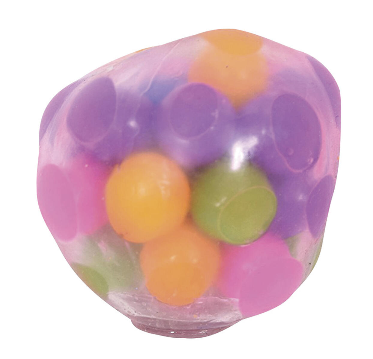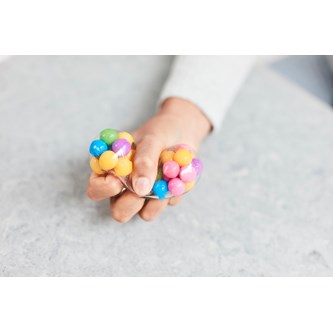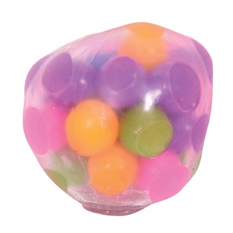 En lugnande stressboll som passar perfekt i handen. Den är fylld med små, mjuka och färgglada gelébollar som rör sig när du klämmer på den. Ytan är genomskinlig och innanför finns mjuka piggar för en extra taktil upplevelse.PVC-fri.
