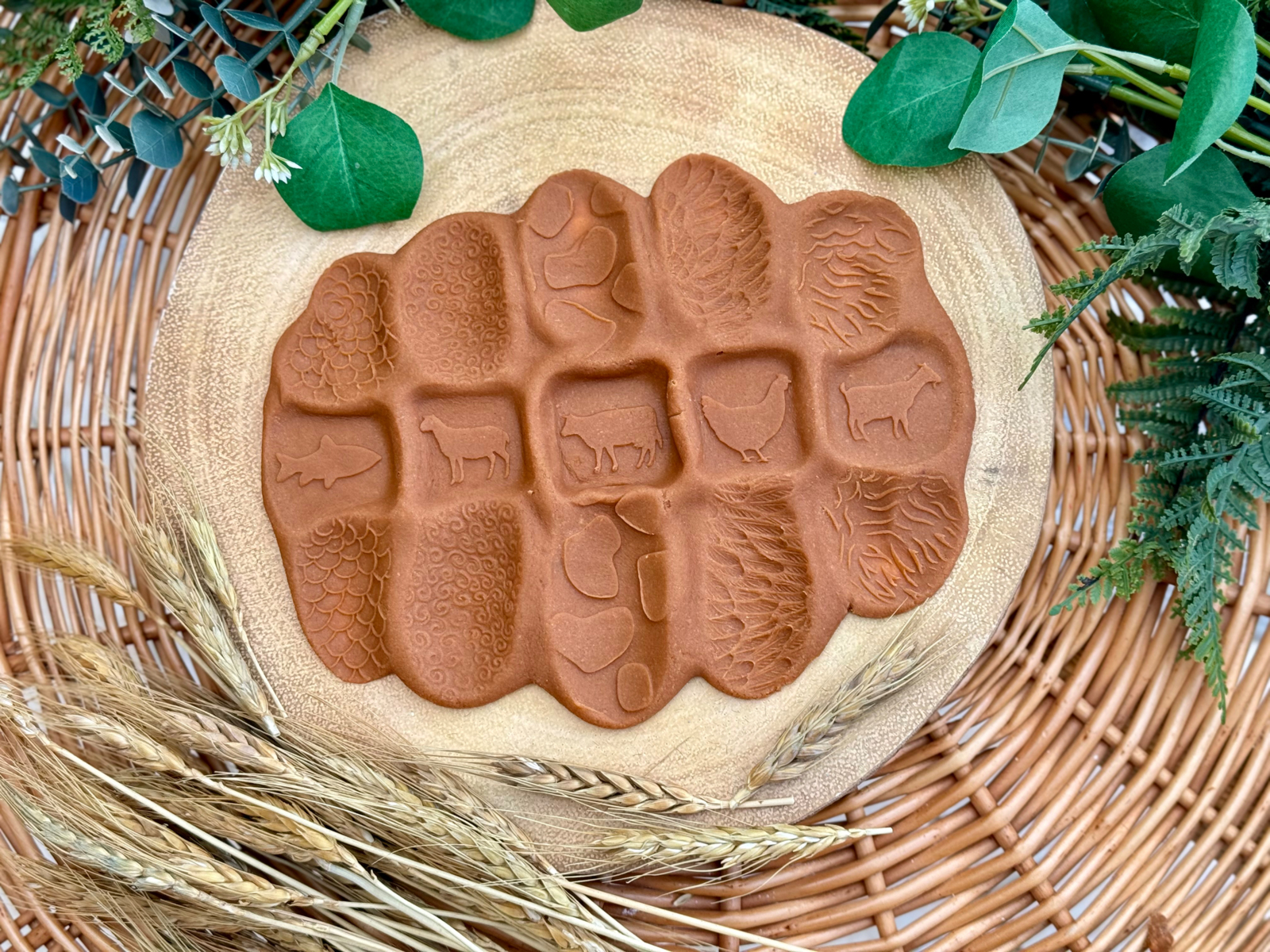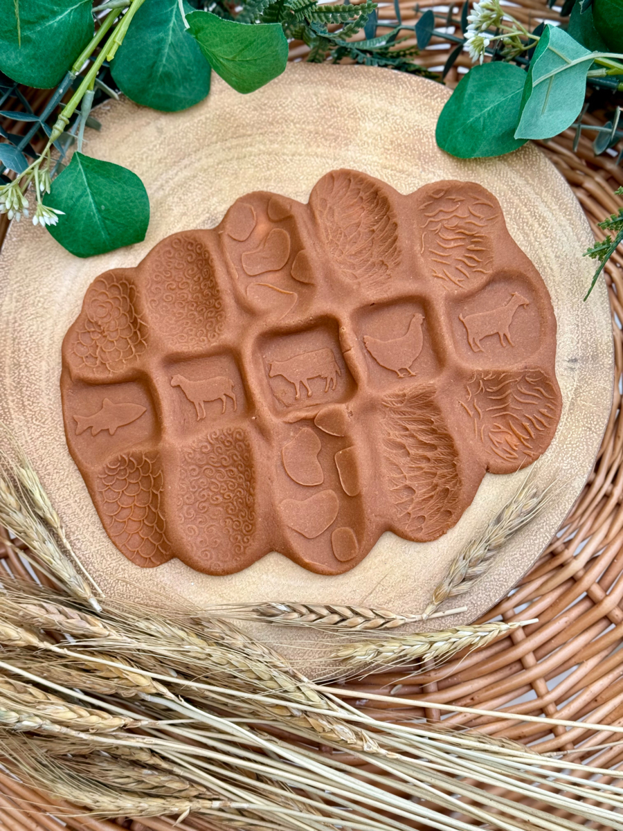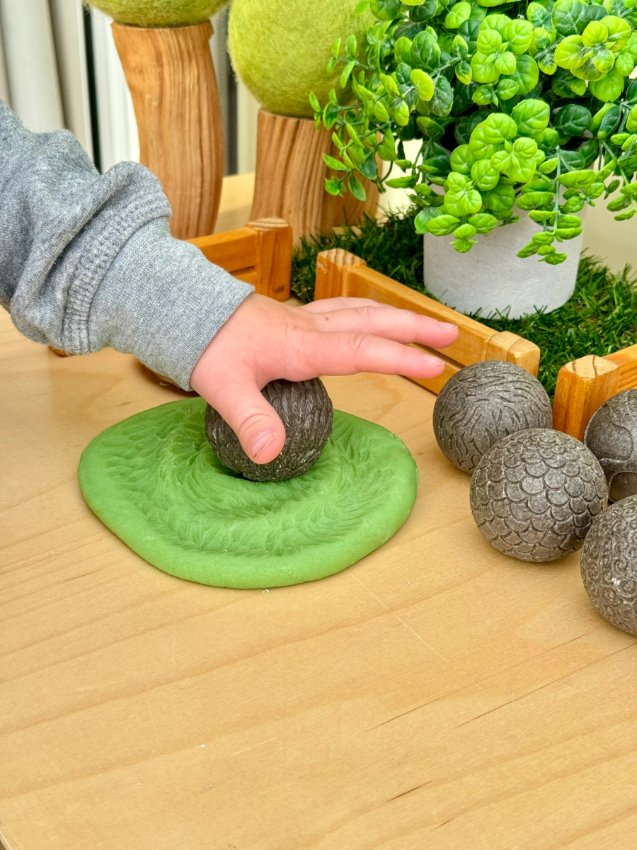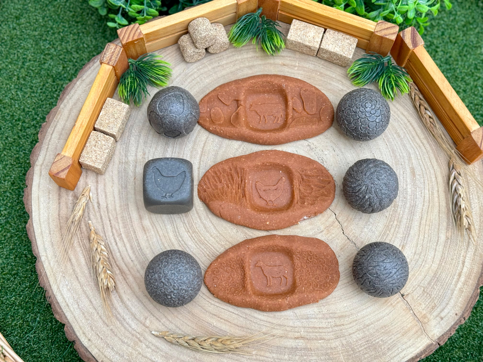 Dessa engagerande stenkulor visar djur på bondgården och i dammen: ko, får, höna, fisk och get. Genom att rulla dem i lera så visas olika mönster. De utvecklar finmotoriken och väcker nyfikenheten. Varje stenkula har ett mönster från ett av djurens hud/päls och tärningen visar de olika djuren. Passar bra inomhus som utomhus. Material: sten. Mått: 4,5 cm. Från 2 år.