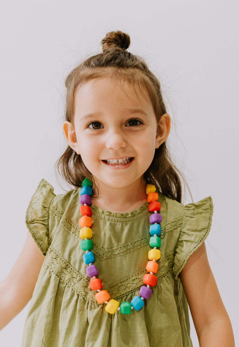 Mellan – fast i tuggmotstånd. Barnen kan tugga på halsbandet istället för på annat. Säkerhetsknäppning. Mått: L53 cm. Livsmedelsgodkänd silikon. Kan tvättas av i varmt vatten med tvål. PVC-fri. Från 3 år. Även om dessa tuggverktyg är robusta och hållbara, är inget tuggverktyg oförstörbart. De slits ut olika fort beroende på hur de används. Övervaka barnet vid användning, inspektera regelbundet halsbandet och kassera vid första tecken på slitage.