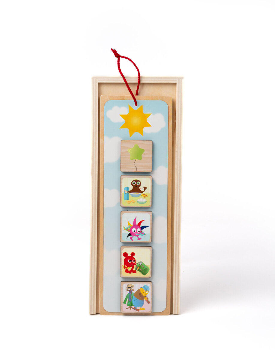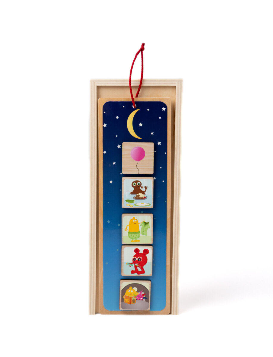 Skapa struktur med Babblarnas aktivitetstavla. På ena sidan visas en himmel med moln och sol och på andra natthimmel med stjärnor och månen. Ytan är magnetisk så att de medföljande brickorna kan fästas. Sätt upp olika aktiviteter på tavlan, t.ex. städa undan, gå på toaletten och ta på skorna. Låt barnen vända på brickan när varje del är klar. På baksidan visas en ballong. 16 brickor ingår med olika motiv. Allt förvaras i en praktisk trälåda. Mått på tavlan: 10x30 cm. Brickorna är 4x4 cm. Av lindträ. Från 10 månader.
