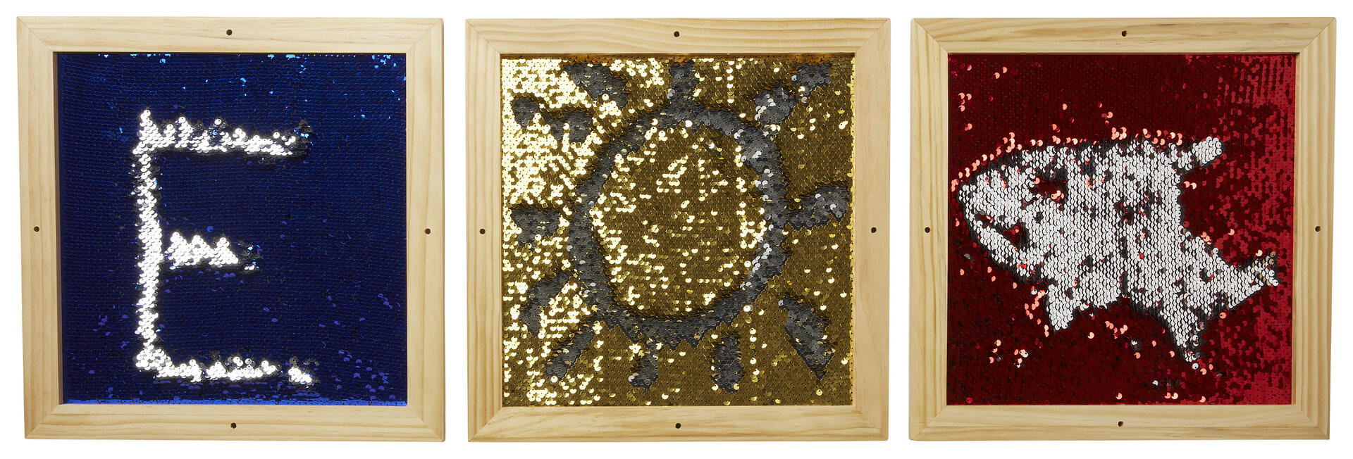 Tre tavlor som kan monteras på vägg. De har taktilt paljettyg som byter färg när paljetterna vänds. Perfekt för sensoriska och finmotoriska aktiviteter. Färgerna kan variera. Mått: 35x35x1,5 cm. PVC-fri. Från 3 år.