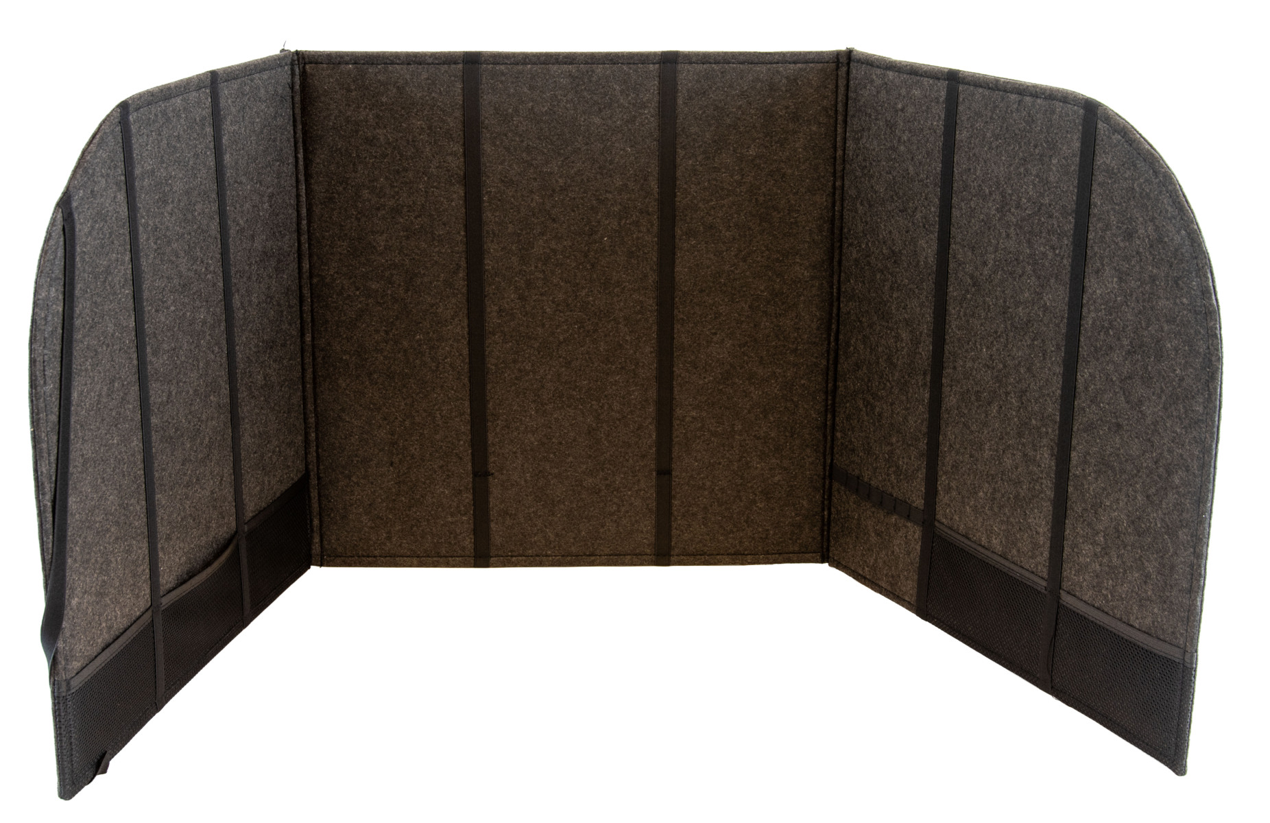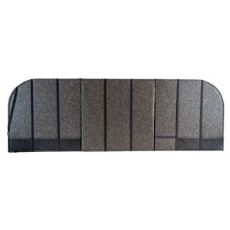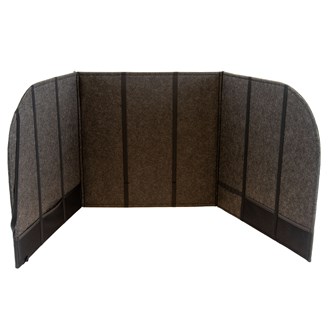 Denna ljuddämpande bordsskärm är utmärkt när behov finns av avskildhet i en större grupp. Den ger hjälp med att fokusera på en uppgift genom att skapa ett eget tyst rum i rummet. Skärmen består av tre delar som man lätt vinklar till önskat behov. Efter användning kan skärmen hängas på väggen och fungerar då som en ljudabsorbent. Kardborre håller vikningen på plats. Grå kantlist. Mått: 50x50x50 cm. Material: Syntetfilt av minst 50 % återvunnet material. 100 % återvinningsbar. Tyg: 100 % ull.