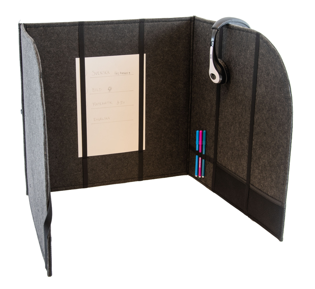 Ljuddämpande bordsskärm för effektiv avskärmning mellan elever. Perfekt för ökad koncentration och inlärning samt vid provskrivning. Skärmen är utrustad med förvaringsfack, pennhållare och remmar för förvaring av papper och studiematerial. Skärmen är upphängningsbar och hopvikbar vilket gör den till en platsbesparande ljudabsorbent. Mått: 50x50x50 cm. Produkten har Oeko-Tex® Standard.