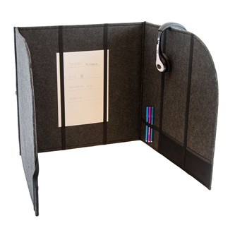 Denna ljuddämpande bordsskärm är utmärkt när behov finns av avskildhet i en större grupp. Den ger hjälp med att fokusera på en uppgift genom att skapa ett eget tyst rum i rummet. Skärmen består av tre delar som man lätt vinklar till önskat behov. Efter användning kan skärmen hängas på väggen och fungerar då som en ljudabsorbent. Mått: 50x50x35 cm. Material: Syntetfilt av minst 50 % återvunnet material. 100 % återvinningsbar.