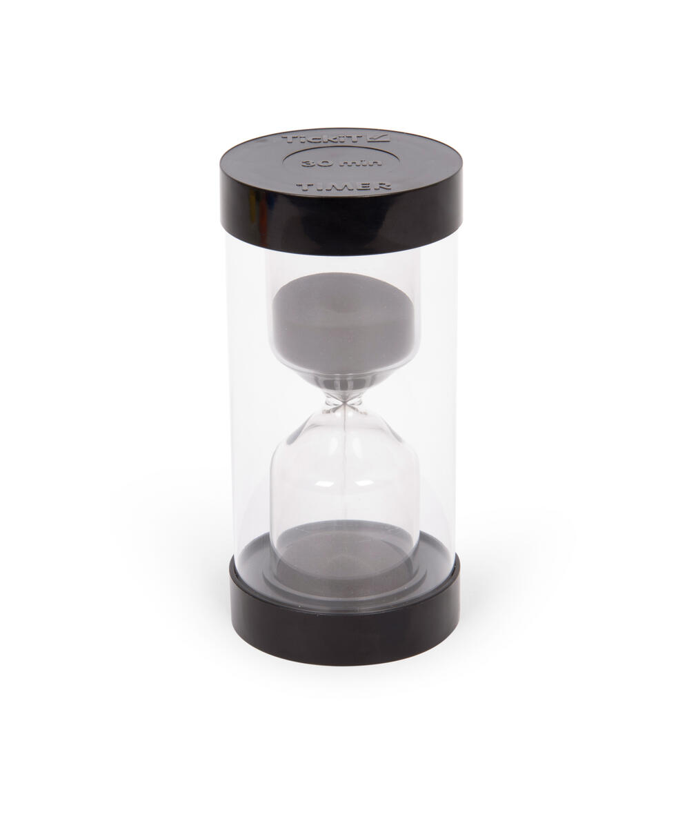 30 min, svart. Hållbara, stora och rejäla timglas i klar plast med gjutna basplattor. Konkretiserar tiden och tidsbegreppen för barnen. Perfekt för experiment, tidtagning, spel och lek. Av PE, PU och akrylplast. Höjd: 15 cm. PVC-fri. Från 3 år.