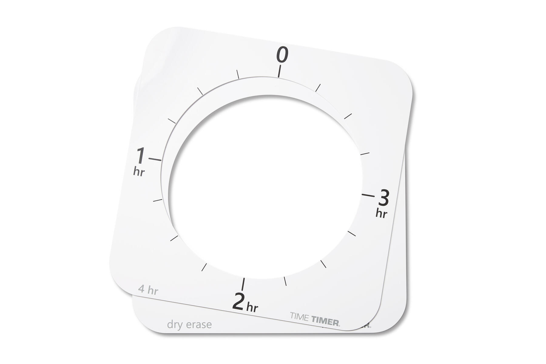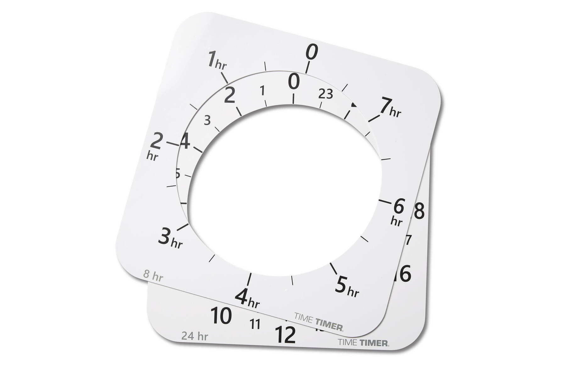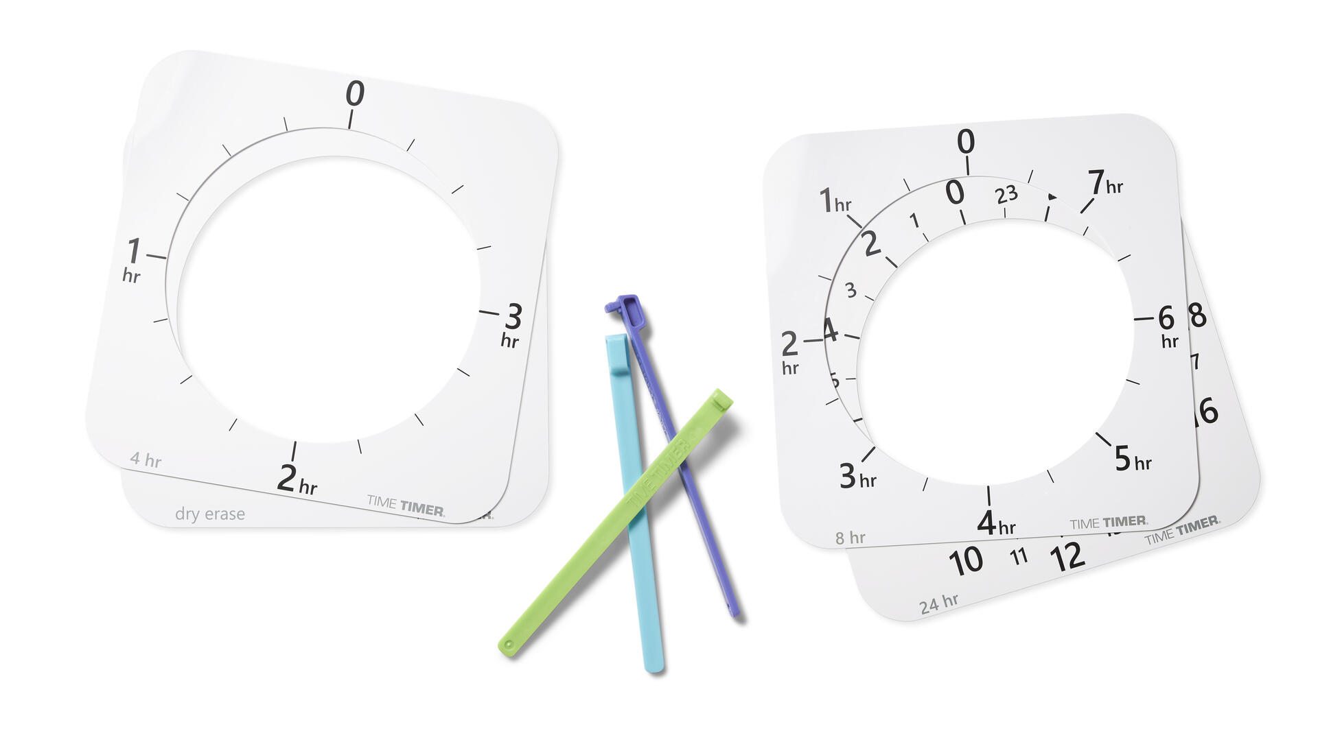 Tillbehörsset med 2 dubbelsidiga plattor (4-timmars, 8-timmars, 24-timmars och en med whiteboardyta), och ett set med 3 visare i olika färger.
