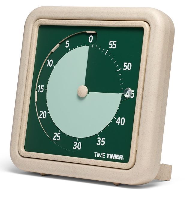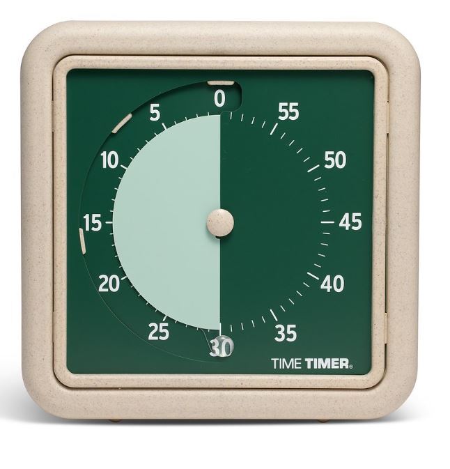 Time Timern håller koll på tiden både individuellt och i grupp. Denna version är gjord av 50 % mindre plast. Kan stå på bord eller hänga på vägg. På/av-knapp för alarm på baksidan. Drivs av 1 st AA/1,5 V-batteri (ingår inte). Mått: 19x19 cm.