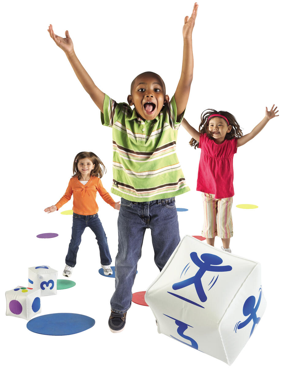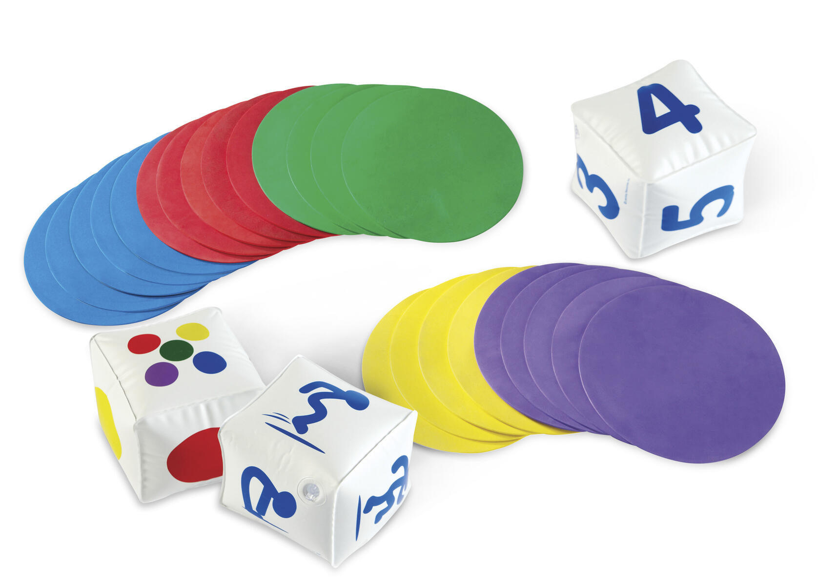 Lägg ut mattbitarna på golvet och rulla tärningarna. Barn på matchande mattor utför den aktivitet som tärningen visar. Innehåller fem runda mattor av skummaterial i fem olika färger och tre uppblåsbara tärningar som visar färg, antal och aktivitet. Storlek på matta: ø 25 cm. Från 4 år.