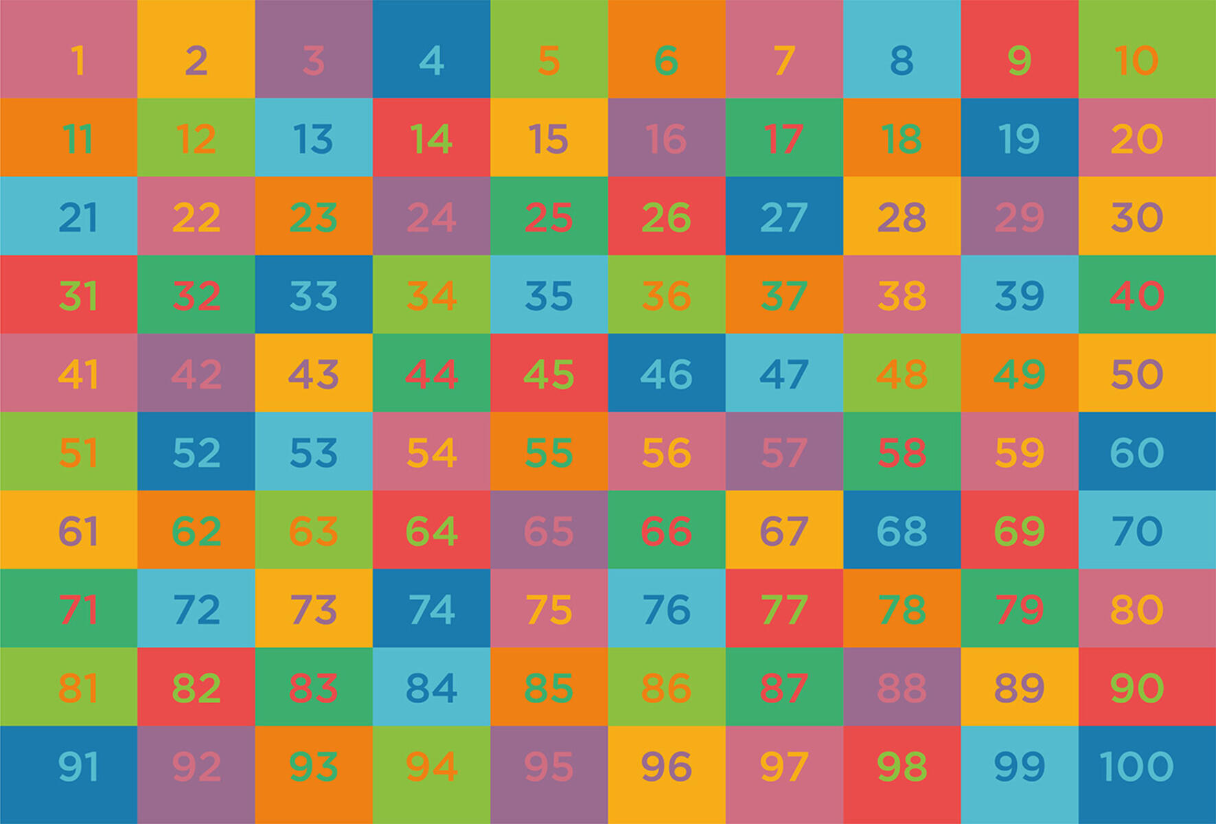 Färgglad lekmatta med siffror 1-100. Passar till aktiviteter som lär barn och elever om siffror, färger och sortering. Mått matta: 140x200 cm. Mått rutor: 20x14 cm.