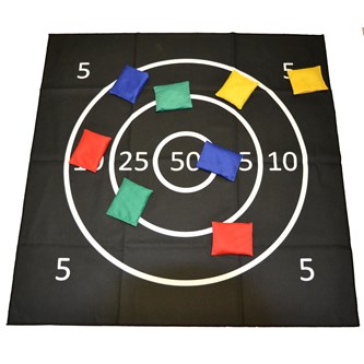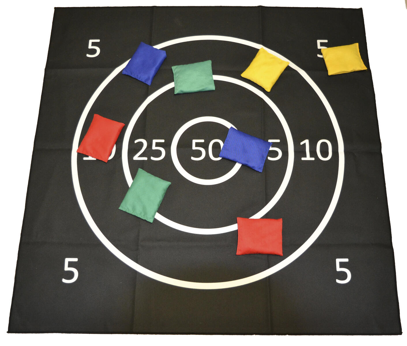 8 ärtpåsar och förvaringsväska ingår. Ett enkelt och kul kastspel där barnen tränar precision och koncentration. Mattans mått: 100x100 cm. Matta av PE. PVC-fri. Från 3 år.