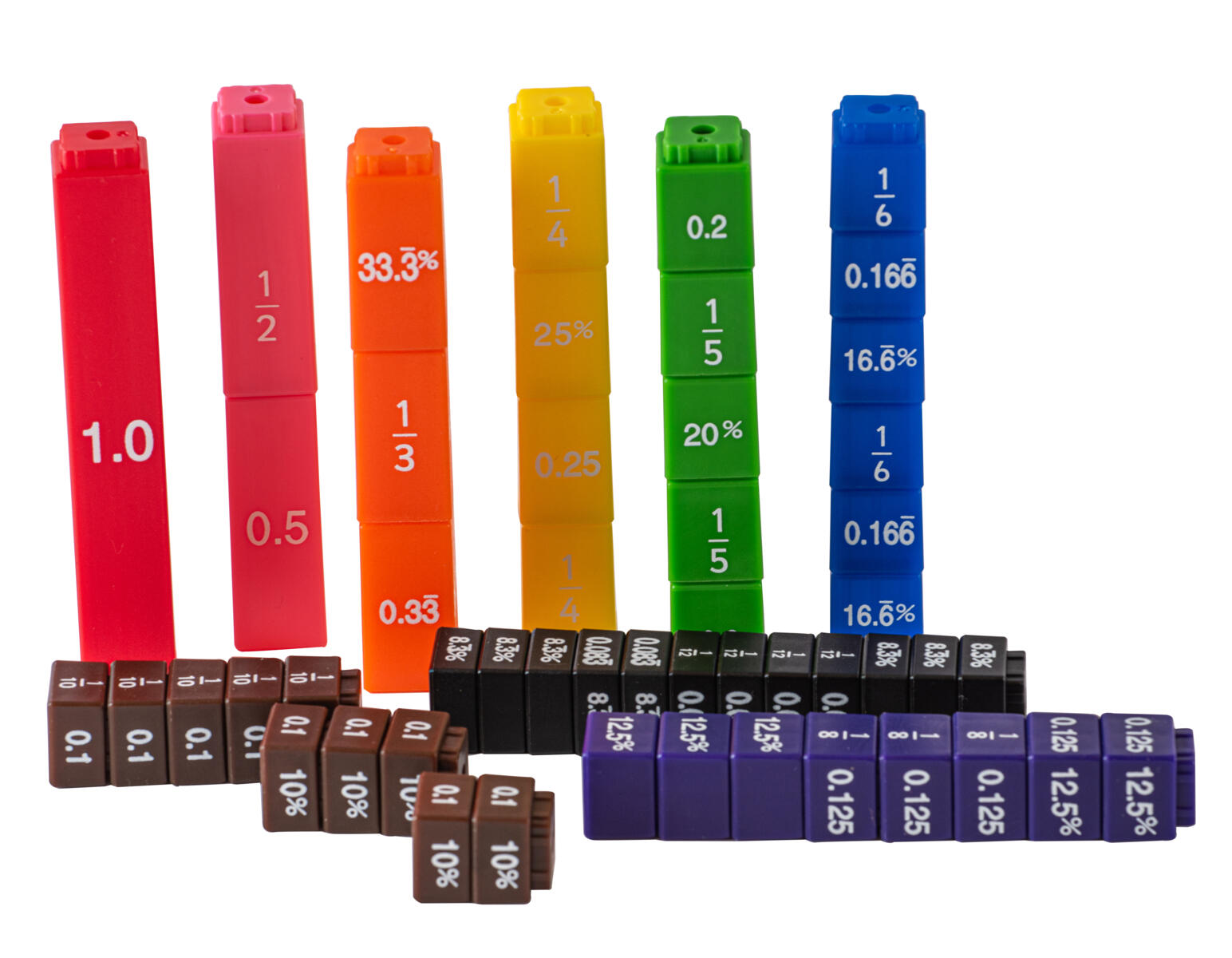 Ett konkret material som tydligt demonstrerar relationerna mellan bråk, procent och decimaler. Ett set med 51 kuber som är enkla att sätta ihop och bygga på höjden med.