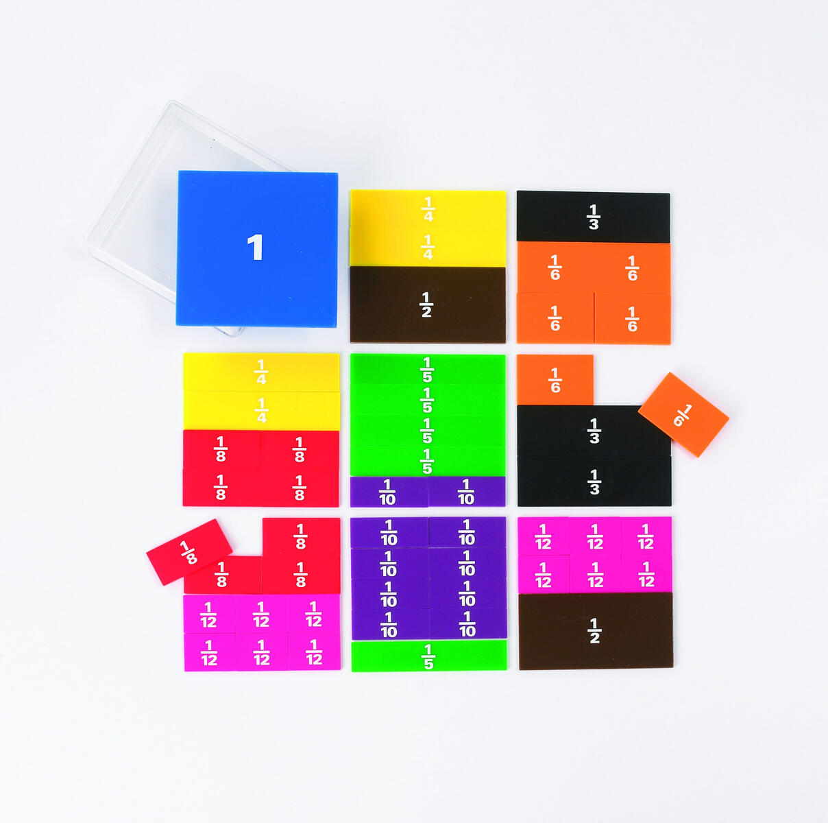 Ett bra material för att förstå bråkdelar. Setet består av 51 proportionerliga delar av bråk. Demonstrerar bråken hela, halva, tredje-, fjärde-, femte-, sjätte-, åtton-, tion- och tolftedelar i olika starka färger med bråket tryckt på. Mått på 1/1 är 10 cm.