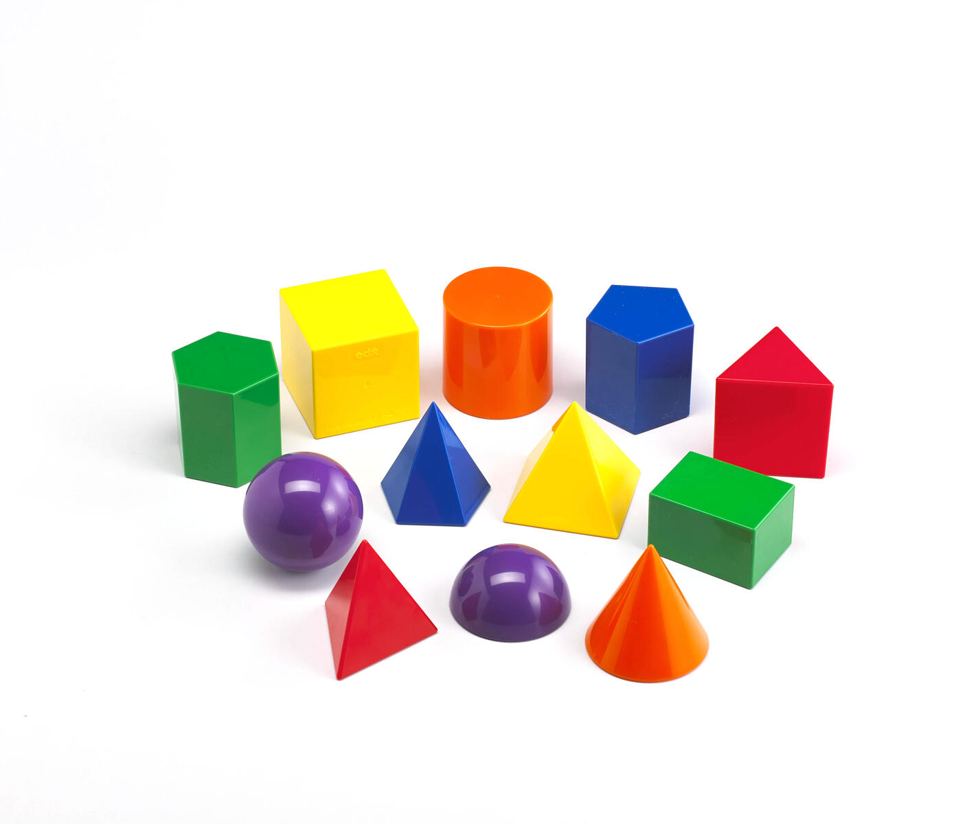 Set i 16 delar som består av 8 transparenta former och 8 utvikta former. Konkret material för inlärning av areal, volym, symmetri och omkrets. Innehåller formerna cylinder, kub, kon, rätblock, hexagonprisma, pyramid, tetraeder och prisma. Höjd ca 8 cm.