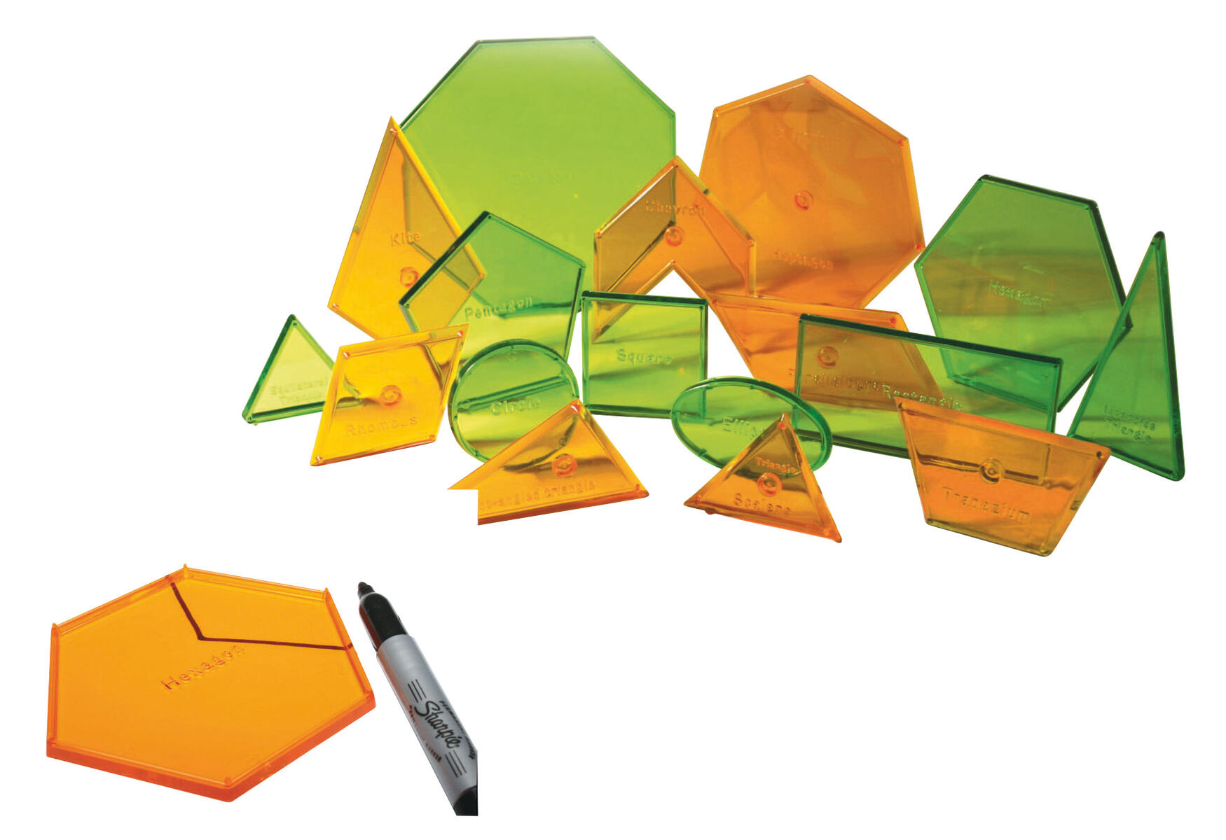 17 st/fp. Innehåller färgade, transparenta geometriska former t.ex. oktagon, hexagon, pentagon, kvadrat, cirkel och triangel. Formerna har vinklade kanter och är idealiska för exakt 2D-teckning. Från 3 år.