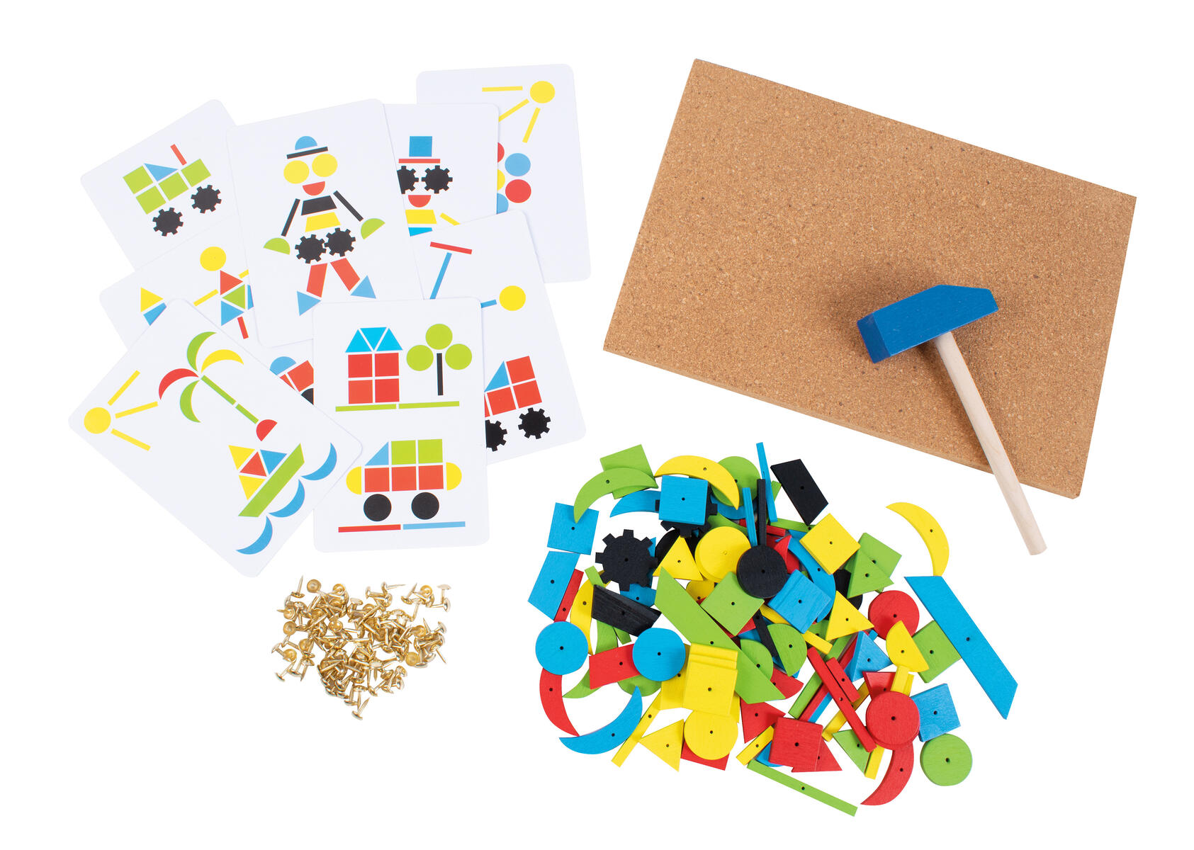 53 delar. Med lite skicklighet och fantasi kan barnen skapa fina motiv och mönster. Använd hammaren och spika fast träformerna i korkplattan. Tränar barnens motoriska färdigheter och koordination. Innehåller: 1 korkplatta, 1 hammare av trä, 45 träbrickor, 1 burk med nubb och 5 motivkort. PVC-fri. Från 4 år.