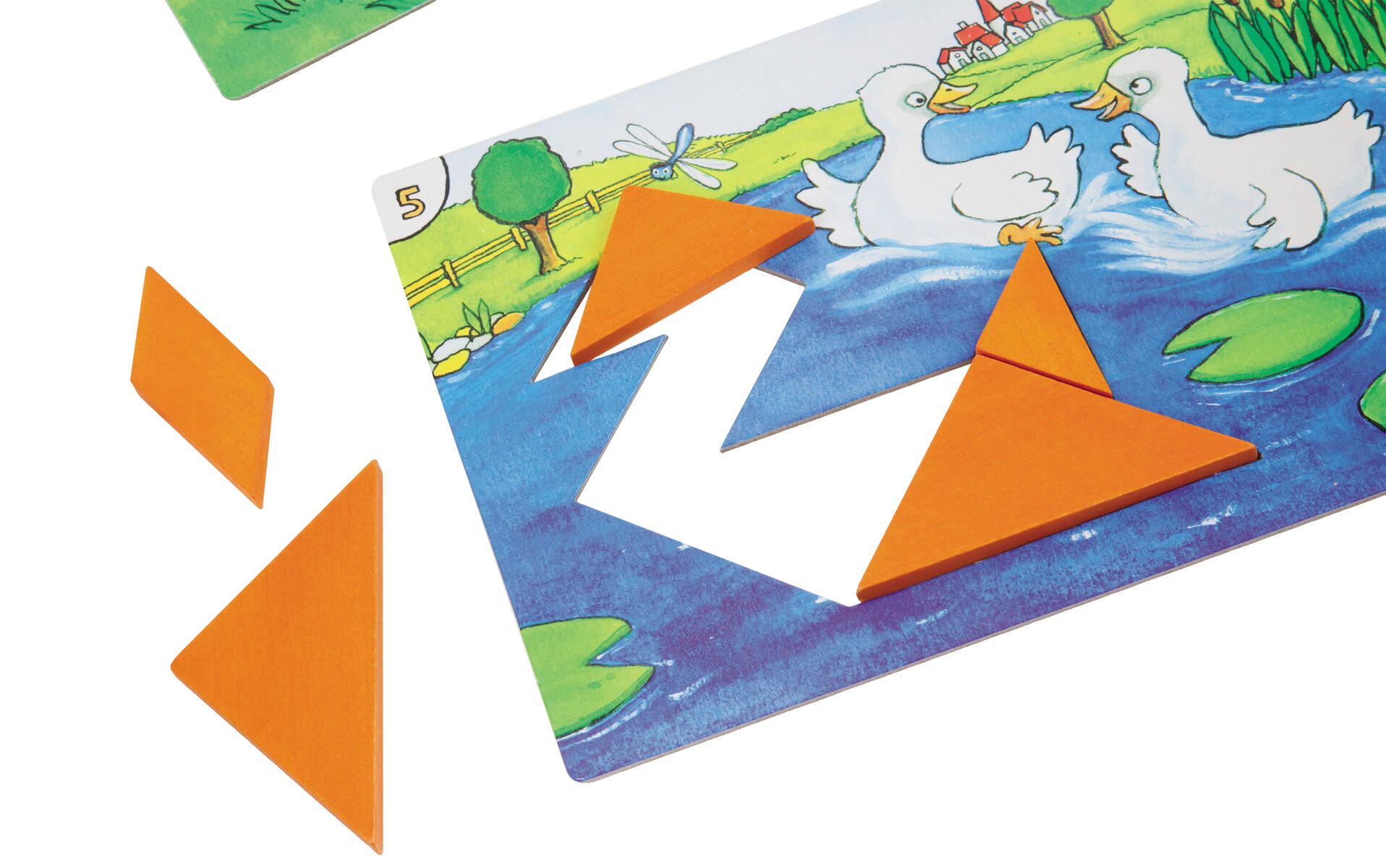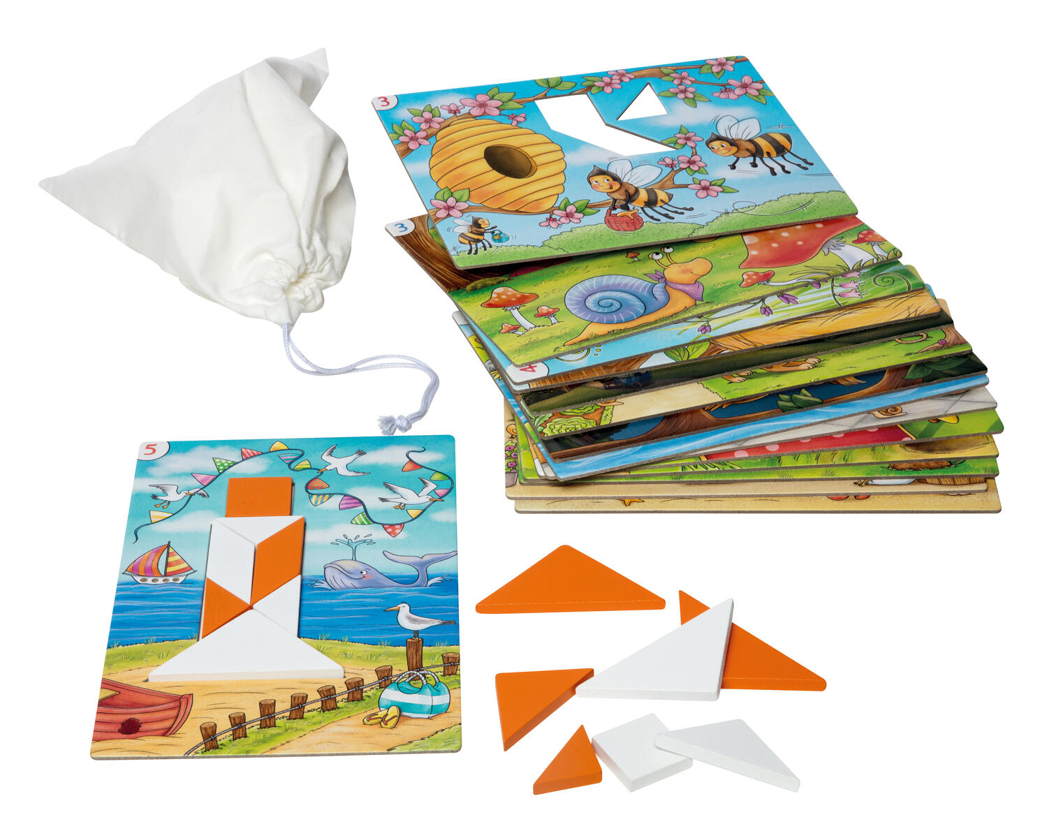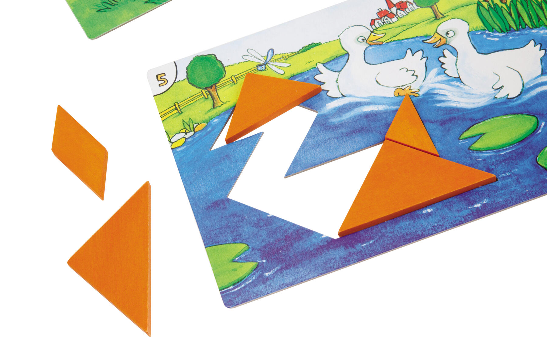 Detta läggspel baseras på det gamla kinesiska tangrampusslet. Barnen ska först fundera ut vilka tangrambitar som behövs för motivkortet och sedan försöka placera dem rätt. Motivkorten ökar i svårighetsgrad så att barnen blir utmanade i sitt lärande. Innehåller 2 set med 7 bitars tangramspussel av trä och 15 motivkort av kraftig kartong. Mått: 21x14,5 cm. PVC-fri. Från 4 år.