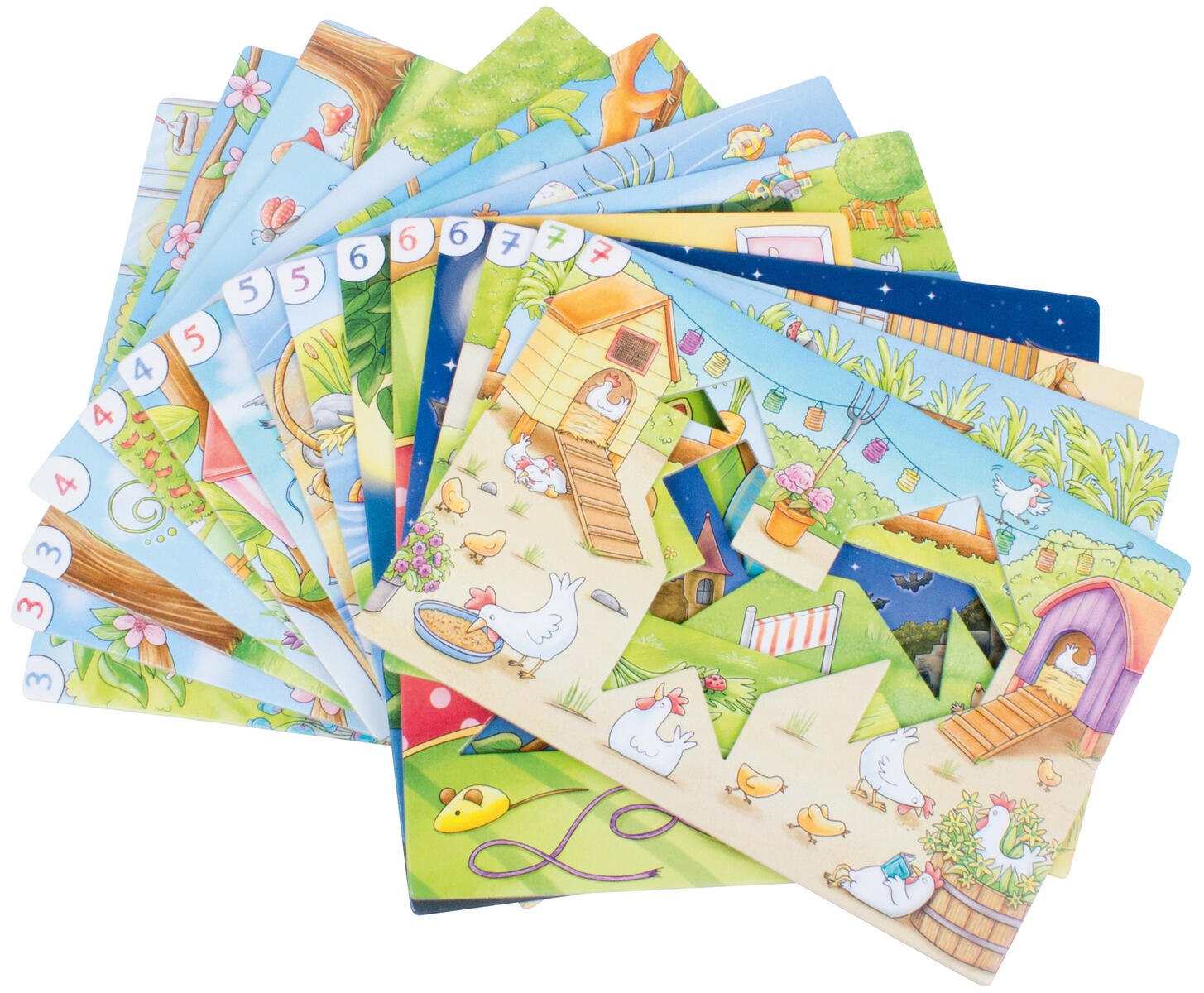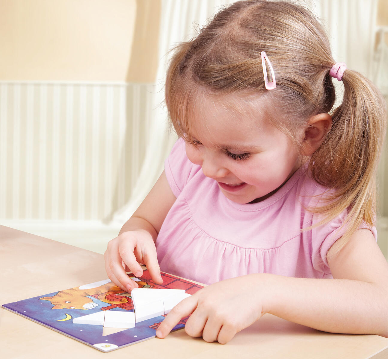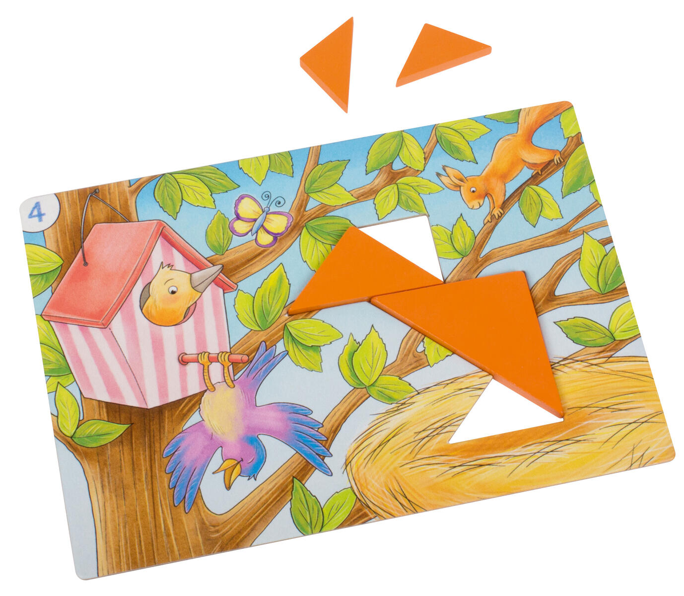 Detta läggspel baseras på det gamla kinesiska tangrampusslet. Barnen ska först fundera ut vilka tangrambitar som behövs för motivkortet och sedan försöka placera dem rätt. Motivkorten ökar i svårighetsgrad så att barnen blir utmanade i sitt lärande. Innehåller 2 set med 7 bitars tangramspussel av trä och 15 motivkort av kraftig kartong. Mått: 21x14,5 cm. PVC-fri. Från 4 år.