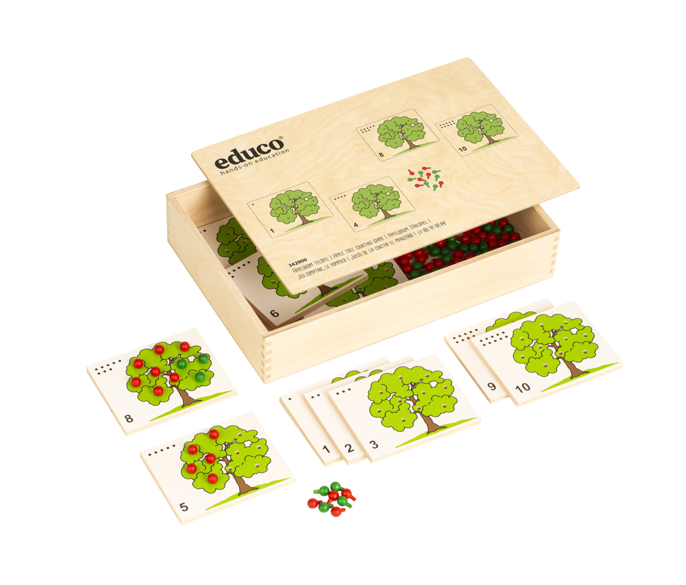 10 träkort med äppelträd, prickar och siffror upp till 10. 60 peggar i två färger. En trälåda för förvaring. Fyll äppelträden med röda och gröna peggar som representerar äpplen. Sätt i så många äpplen som siffran och prickarna på kortet visar. Utveckla finmotoriken och upptäck relationen mellan mängder och siffersymboler upp till 10. Manual på engelska ingår. Trälådans mått: 15x14x5 cm. Från 3 år.