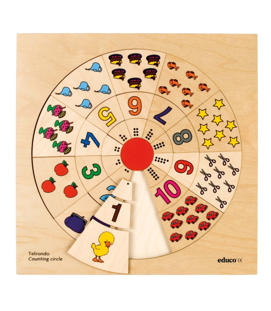 Detta träpussel övar barnen i att lära känna olika talbilder som representerar siffrorna 1-5. Representationerna utgörs av handens fingrar, tärningar, klossar och godis. Pusslet ger också en förberedande träning i att senare kunna läsa av diagram etc. med två axlar. 25 träbrickor som läggs i en träram. Storlek: 23,5x23,5x0,7 cm. PVC-fri.