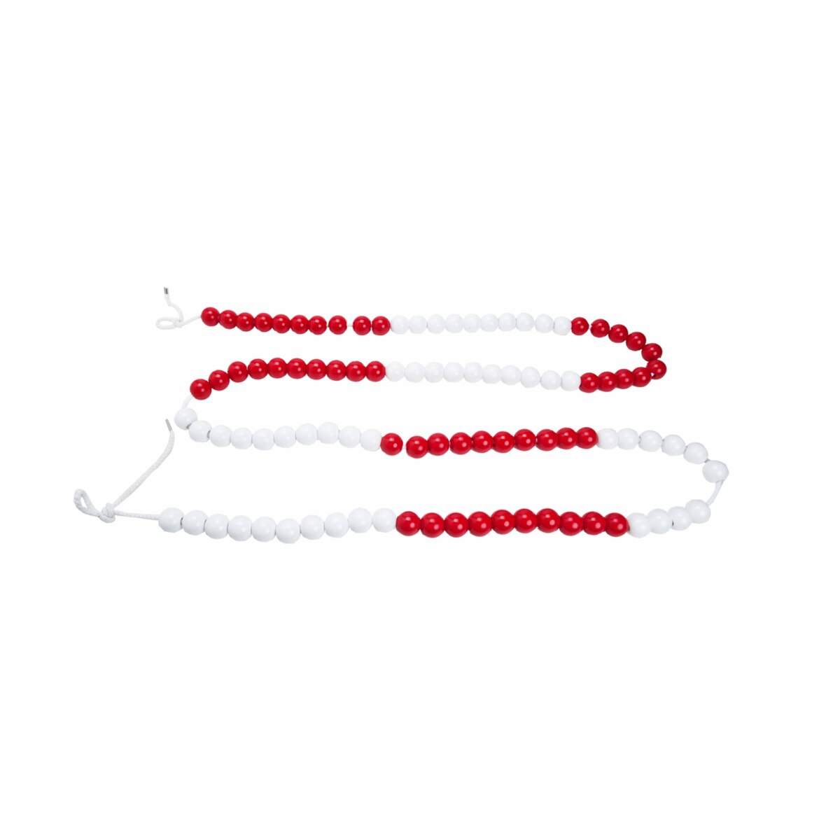 50 röda och 50 vita plastpärlor uppträdda på ett vitt snöre. Räkna och visa tallinjen upp till hundra. Använd för att konkretisera aritmetiska räkneoperationer upp till 100. Pärlorna växlar mellan 10 röda och 10 vita. Mått: snöre 300 cm, pärlorna ø 2,4 cm. Från 6 år.