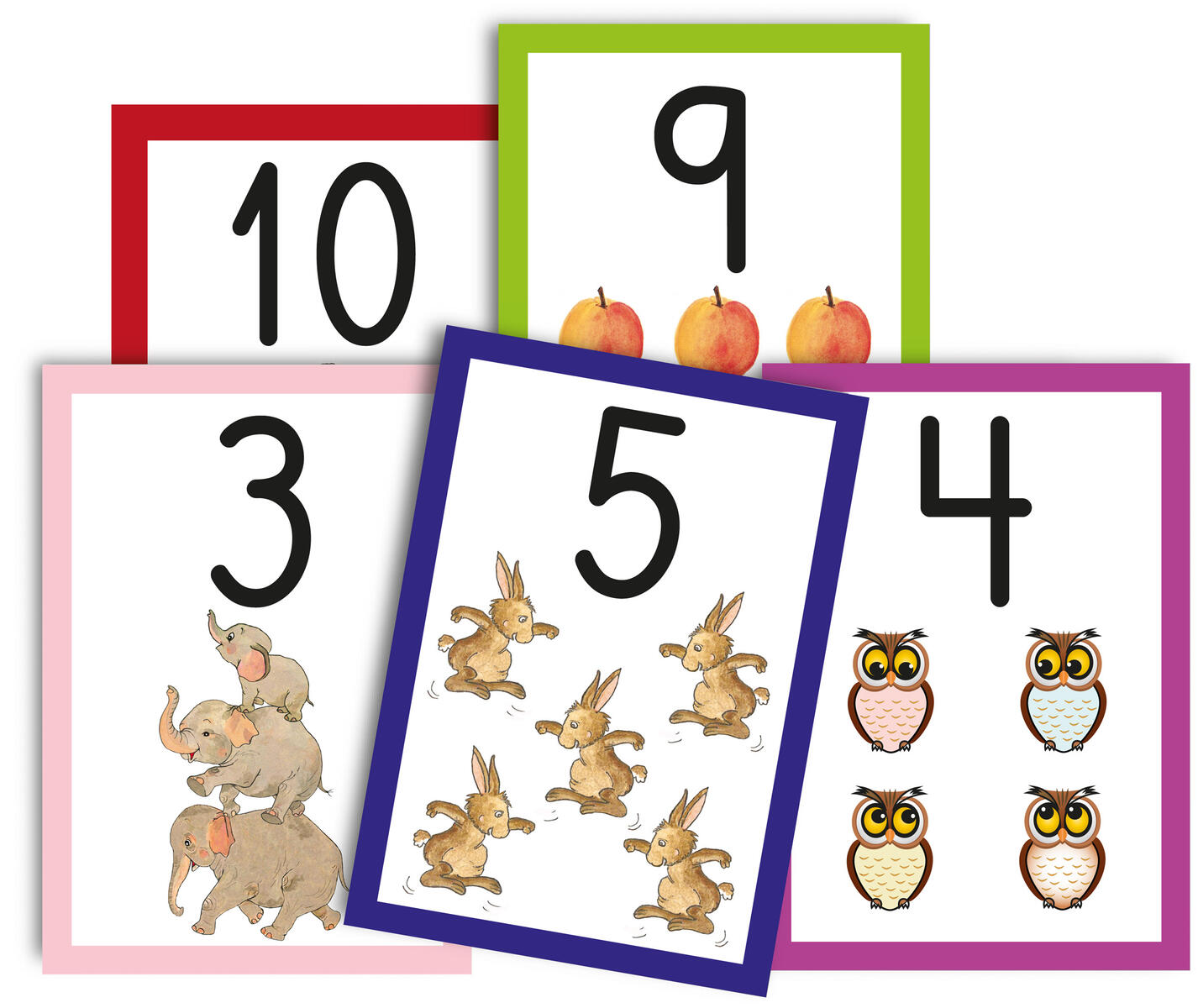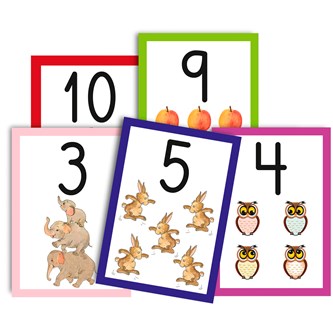 Siffror 0-10 tryckta på kraftig papp. Kan t.ex. plastas eller lamineras in för att göras extra tåligt. Mått: 16x21 cm/kort. Av FSC-märkt papper. PVC-fri.