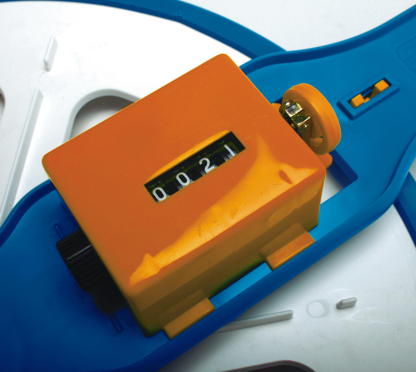 Utöka användningsmöjligheterna med denna räknare som man fäster på mäthjulet. Den håller räkningen åt er, upp till 9999 m. Den kan även ställas in på cm.