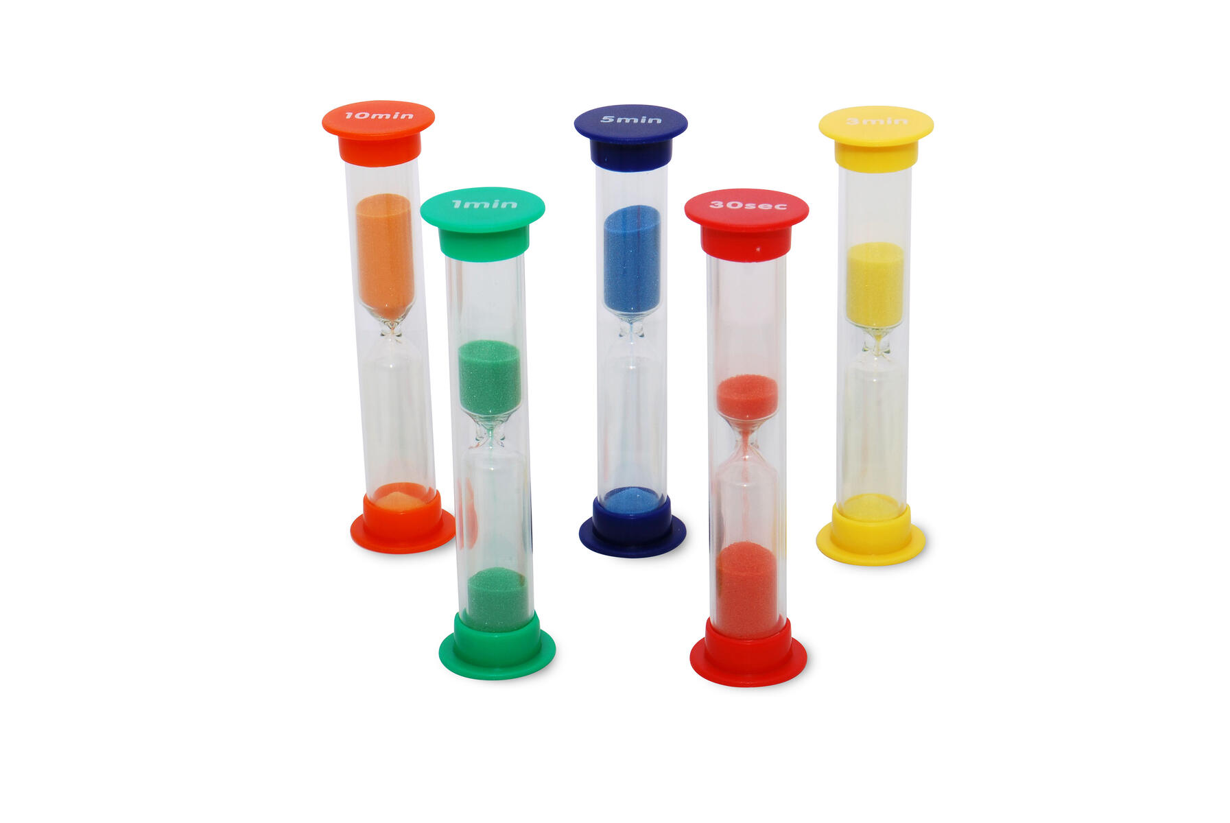 5 timglas i olika tidsintervall och färger. Innehåller 1 av vardera: 30 sek, 1 min, 3 min, 5 min och 10 min. Höjd: 14,5 cm. Av polypropenplast, PVC-fri. Från 3 år.