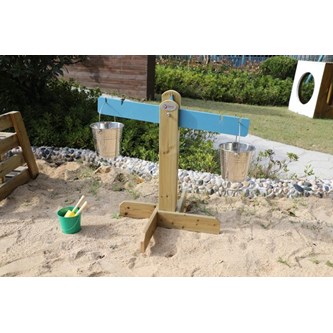 En robust trävåg med metallhinkar för utomhusbruk. Hinkarna kan fyllas med material som sand, vatten och stenar. Barnen kan väga och lära sig om balans samtidigt som de utvecklar matematiskt tänkande. Tillverkad av träskyddsbehandlad furu. Levereras omonterad. Mått: 80x60x72 cm. PVC-fri. Från 3 år. Denna våg är utformad som en leksak och bör inte jämföras med precisionsinstrument.
