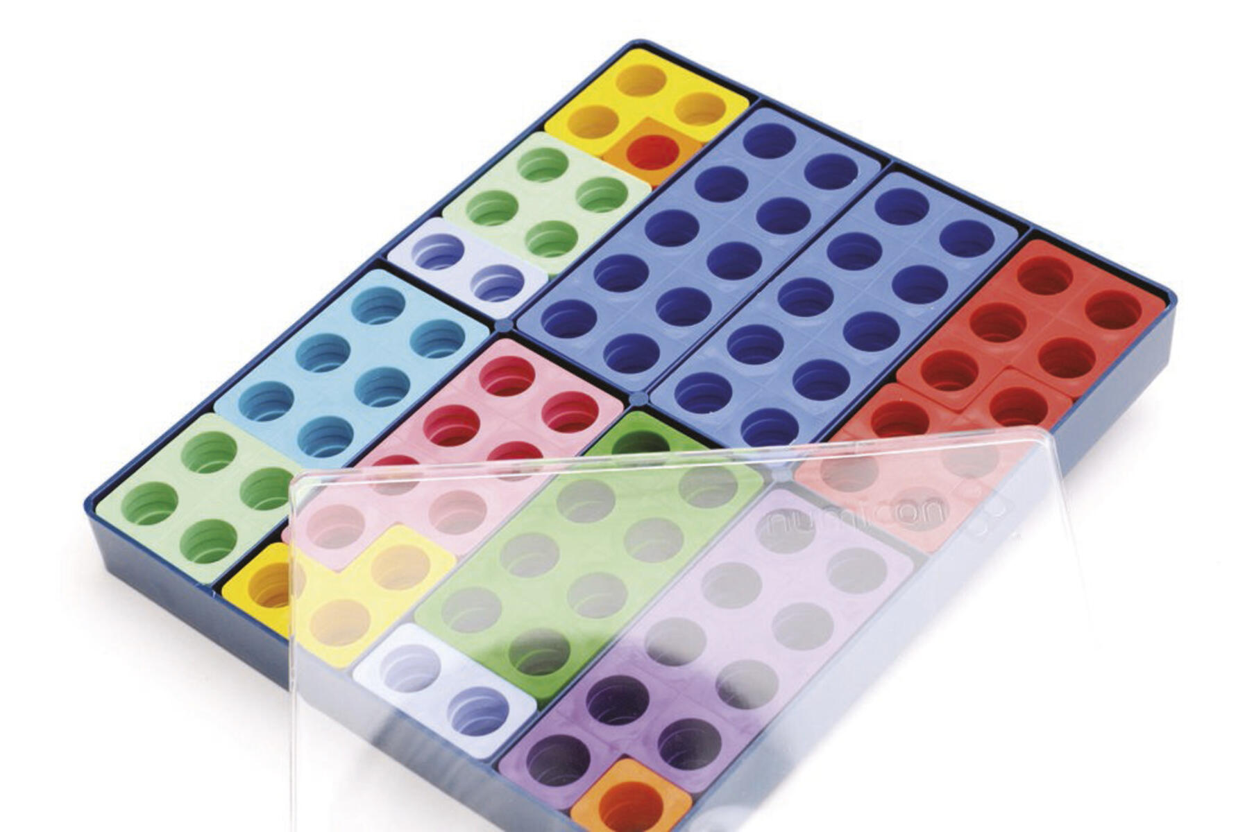 80 st/fp. Mångsidiga ramar för utveckling av matematiskt flyt och resonemang. Den visuella aspekten hjälper till att utveckla en praktisk förståelse av antal och stödjer utvecklingen av räkning och problemlösning. Passar bra att arbeta med både i grupp och enskilt. Träna på att räkna, känna igen tal, sekvensering och samband mellan olika antal. Måttexempel på minsta delen, 2,5x2,5 cm och största delen, 12,5x5 cm. Från 3 år.