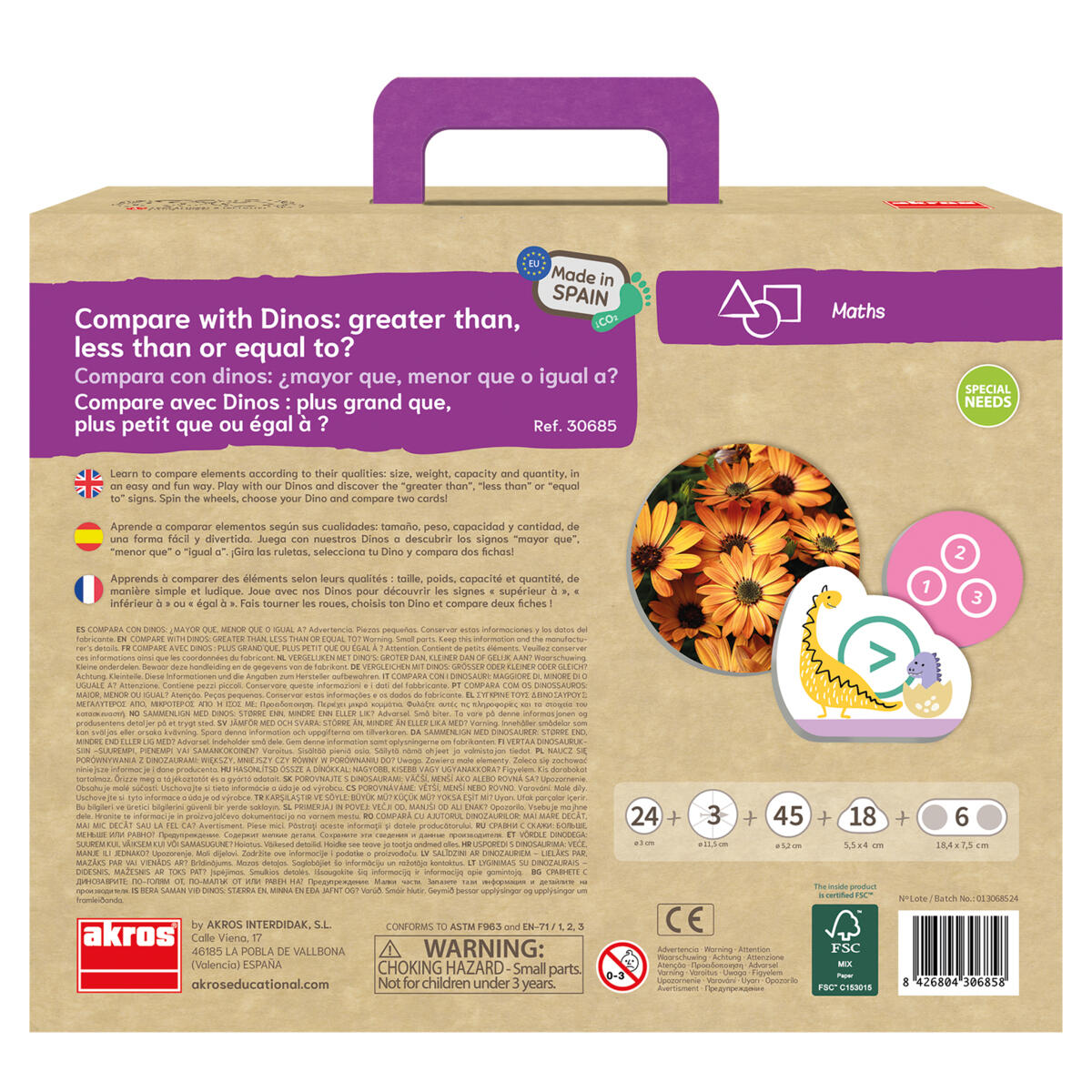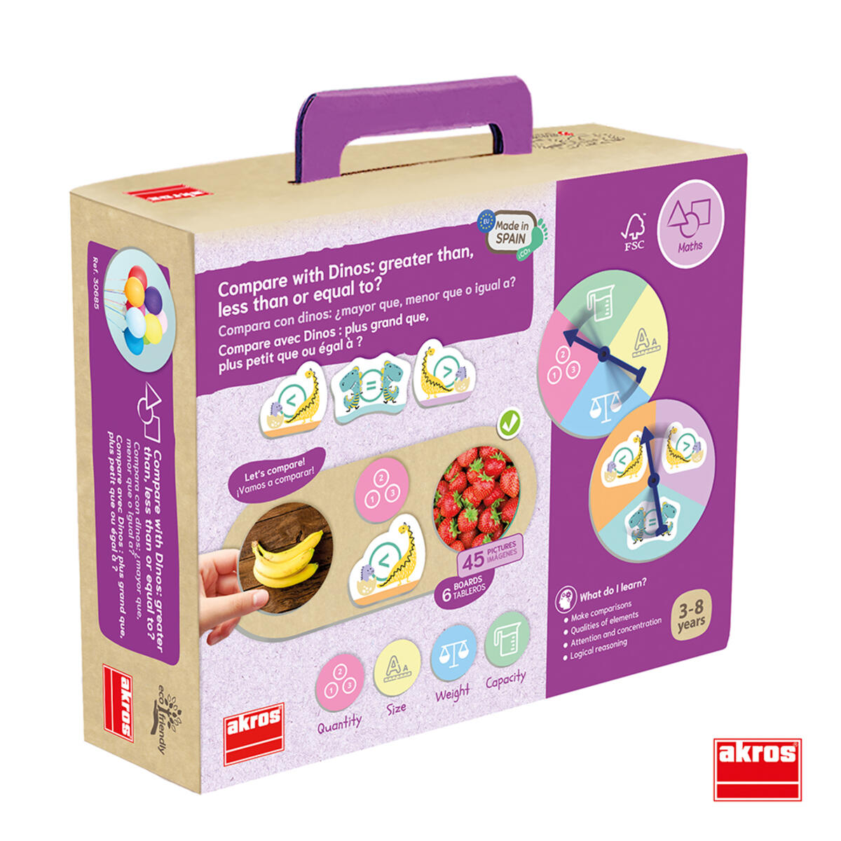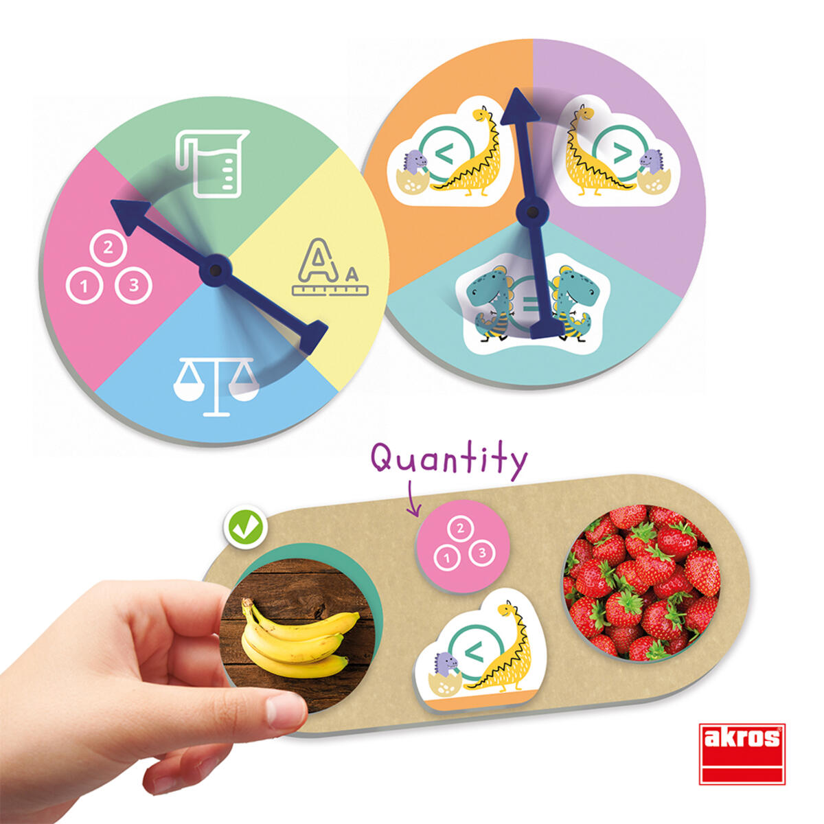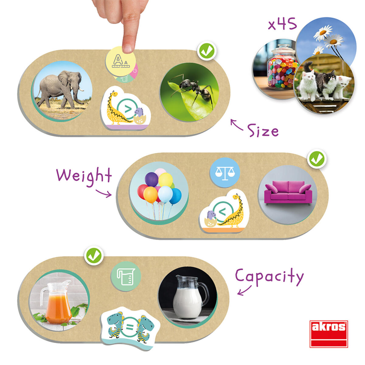 Jämför olika saker med hjälp av deras egenskaper storlek, vikt, volym och antal. Använd dinosaurien för att lära om mer än, mindre än och lika med. Snurra hjulet, välj dinosaurie och välj två kort. Innehåller 6 bräden för 6 barn samt 45 fotokort på saker samt 24 värdekort och 18 mer/mindre/lika med kort. Material kartong. FSC. Från 3 år.