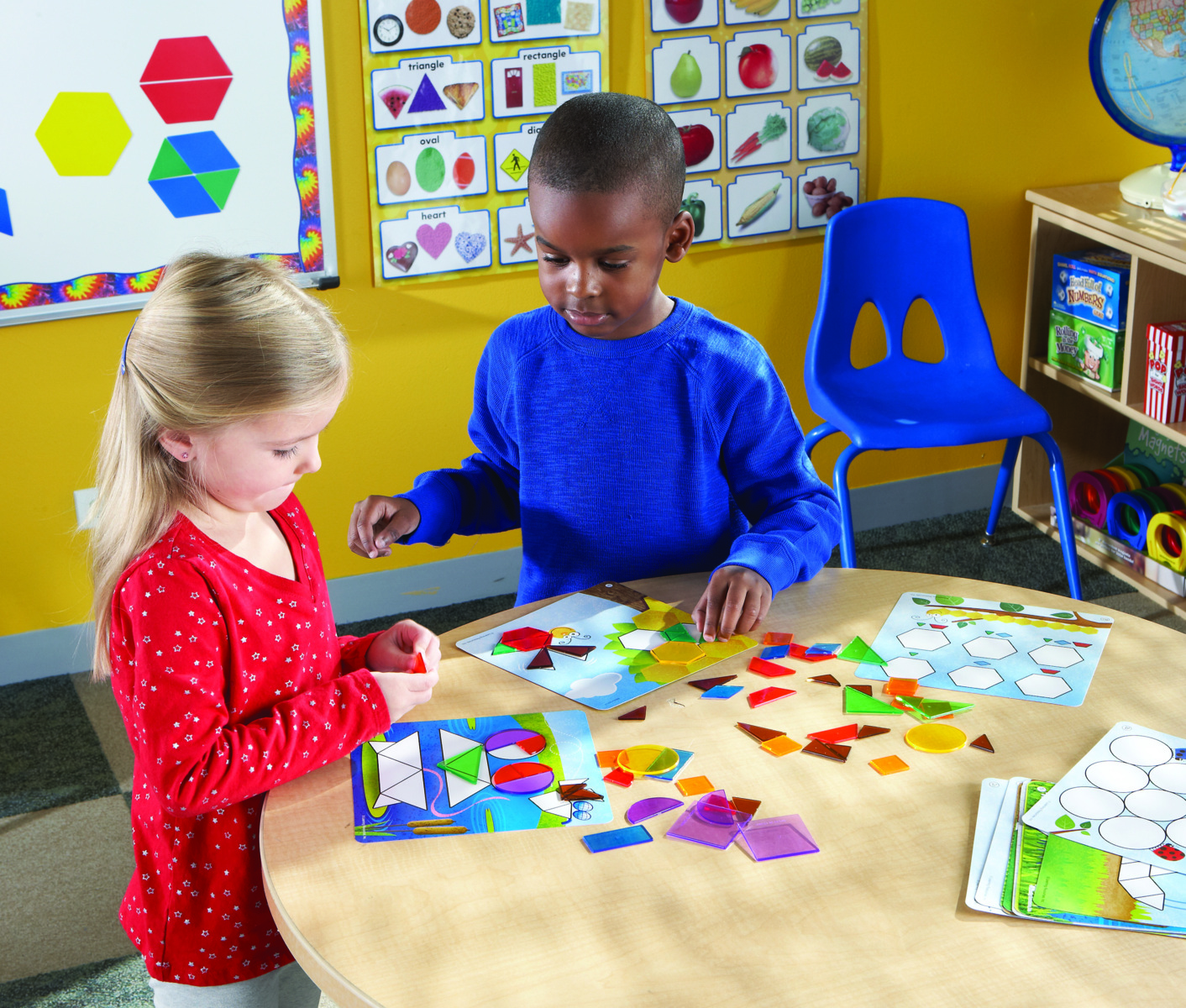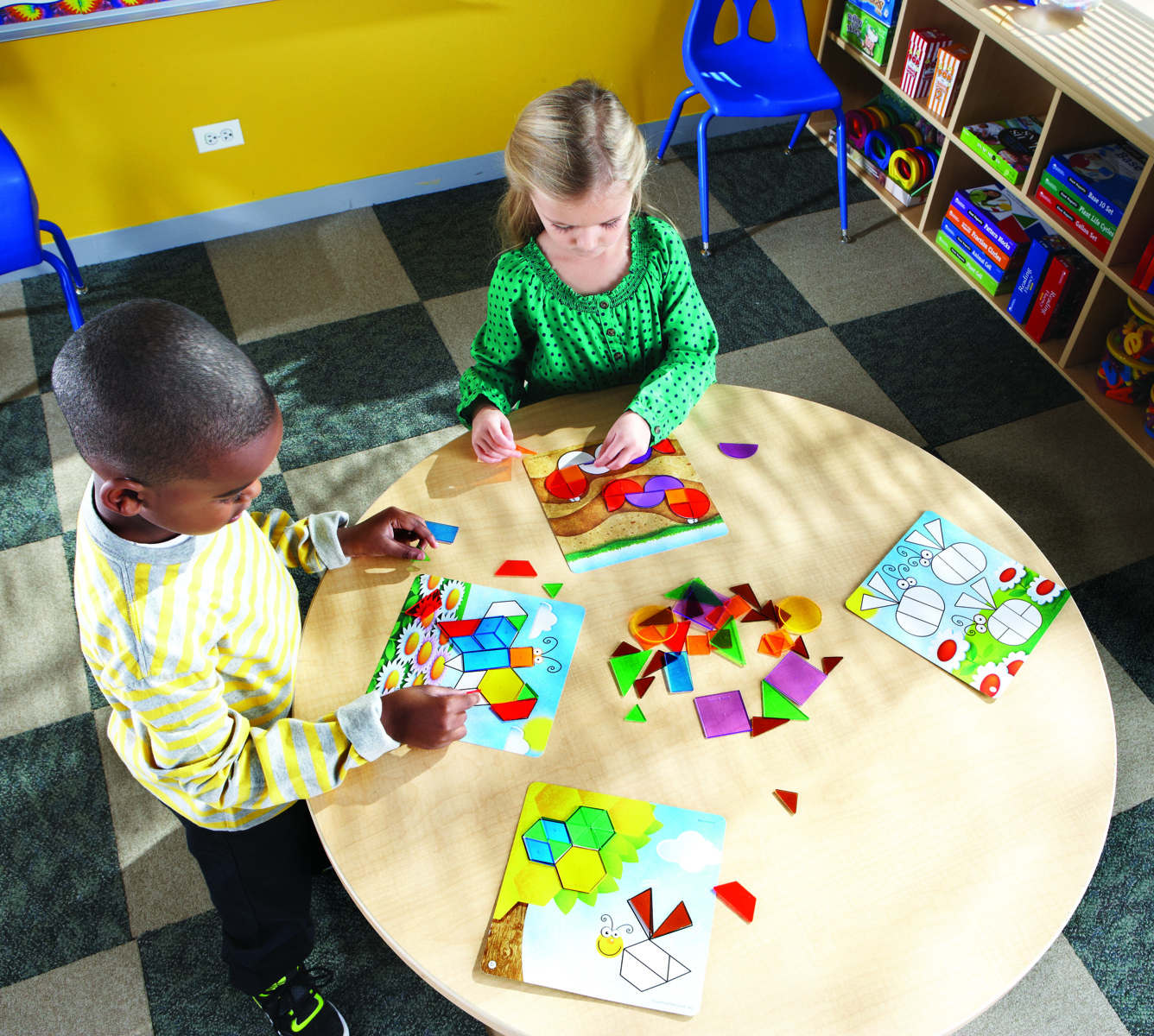 Ett set som innehåller 36 aktivitetskort i varierande svårighetsgrad och 124 plastfigurer i sex olika former och färger. Uppmuntrar barnen till att utforska geometriska mönster. Från 4 år.