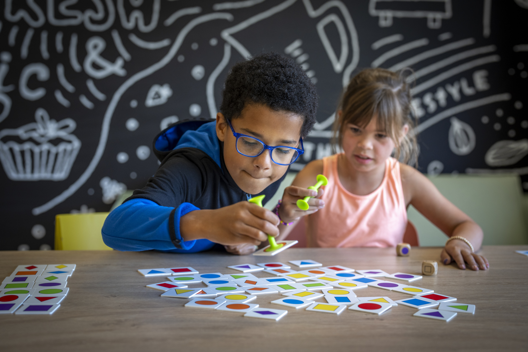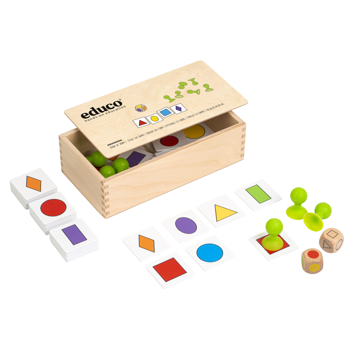Materialet innehåller 72 plastkort med olika former och färger, 6 sugkoppar och tärningar med former och färger. En trälåda för förvaring ingår. Ett material som tränar former och färger. Kan spelas som ett spel där spelarna använder sugkoppar för att "fånga" den formen som tärningen visar. Beroende på barnens ålder kan man spela med en eller båda tärningarna och även variera antal kort. Manual på engelska ingår. Trälådans mått: 24x12,5x7 cm. Från 4 år.