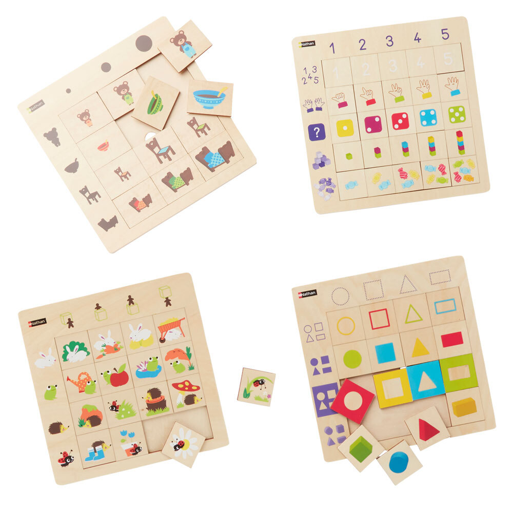 Paket med 4 olika matematiska pussel i trä. Utvecklar förmågor gällande siffror och antal, rumsuppfattning, geometriska formerm och storlekar. PVC-fri. Ålder: från 3 år.