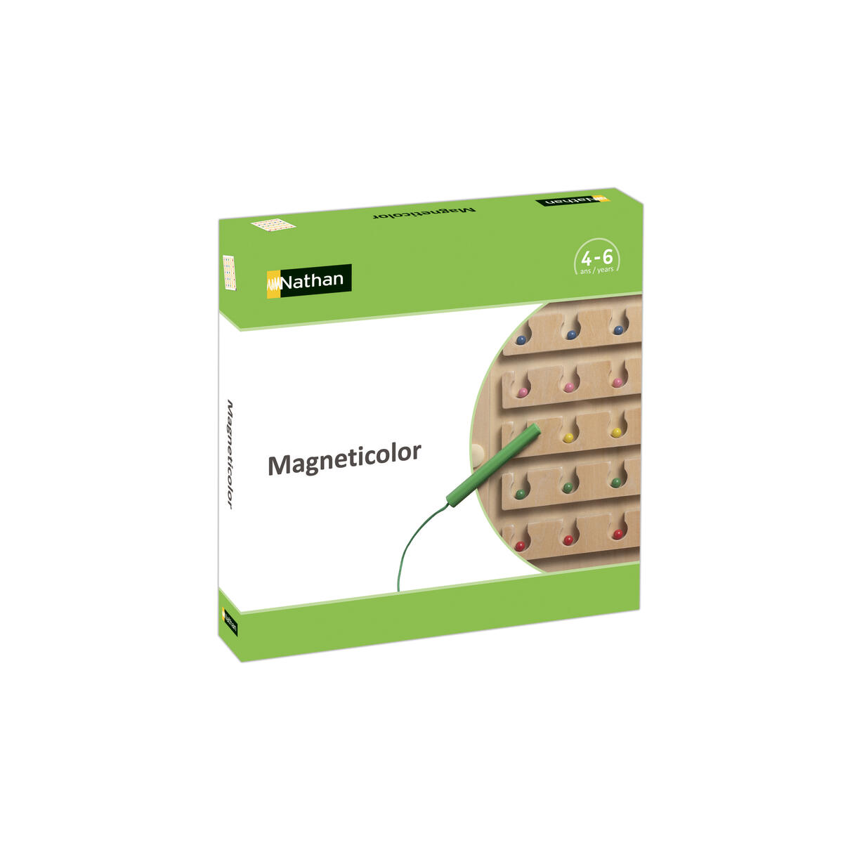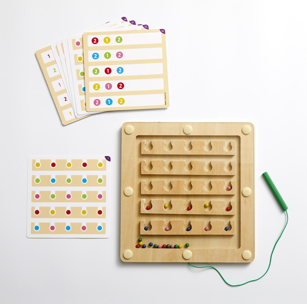 Ett stimulerande spel med magneter som tränar barnens koncentrationsförmåga och tålamod. Flyttar metallkulorna efter korten. Lär barn att identifiera siffror och färger, träna finmotorik och öga-handkoordination samt rumslig medvetenhet. Innehåller 1 spelbräda i trä med plasthölje, 25 kulor av metall, 12 aktivitetskort och 1 lärarhandledning. PVC-fri. Från 4 år.
