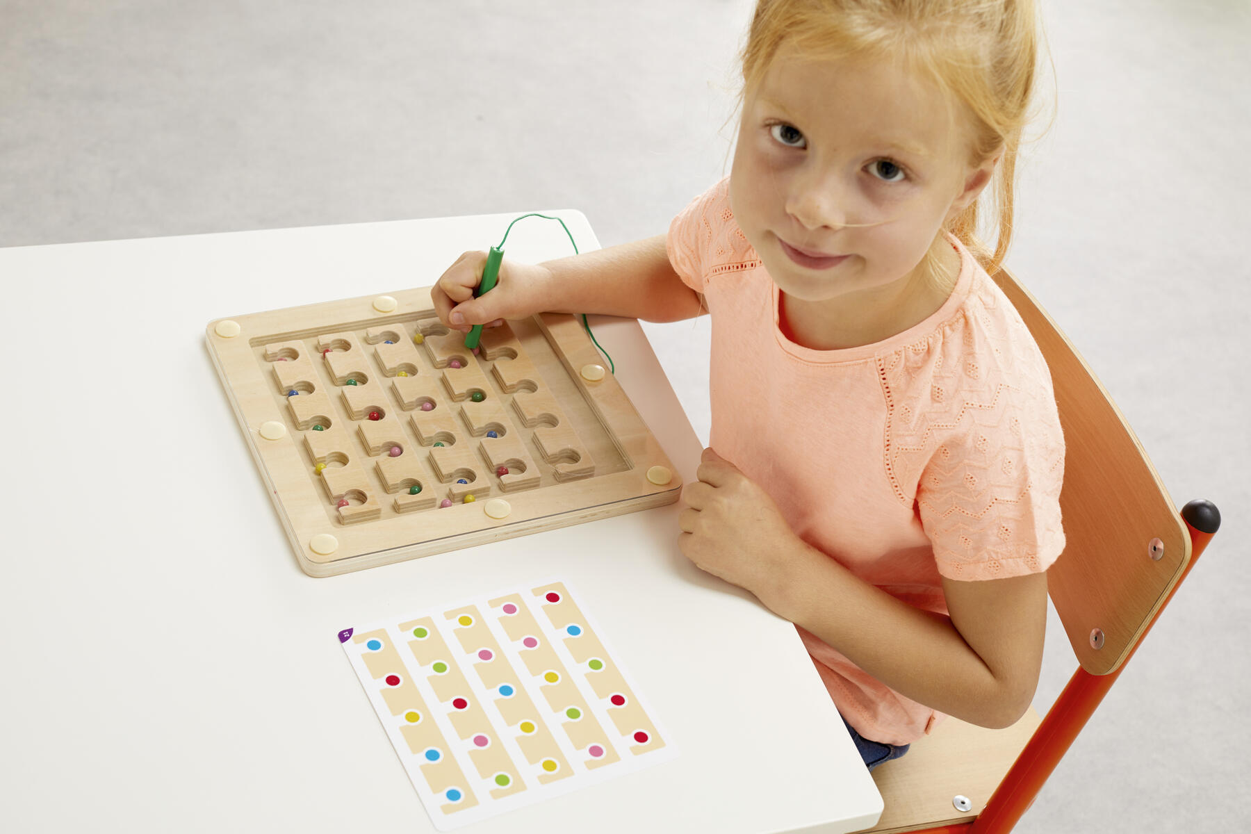 Bygg labyrinter med hjälp av aktivitetskort och testa sedan funktionaliteten genom att styra träkulan från start till mål. Utvecklar rumslig medvetenhet, logik och problemlösning samt koordination mellan hand och öga. Innehåller 1 trälåda för kuber, 16 kuber, 1 träkula, 6 aktivitetskort och 1 lärarhandledning. PVC-fri. Från 4 år.