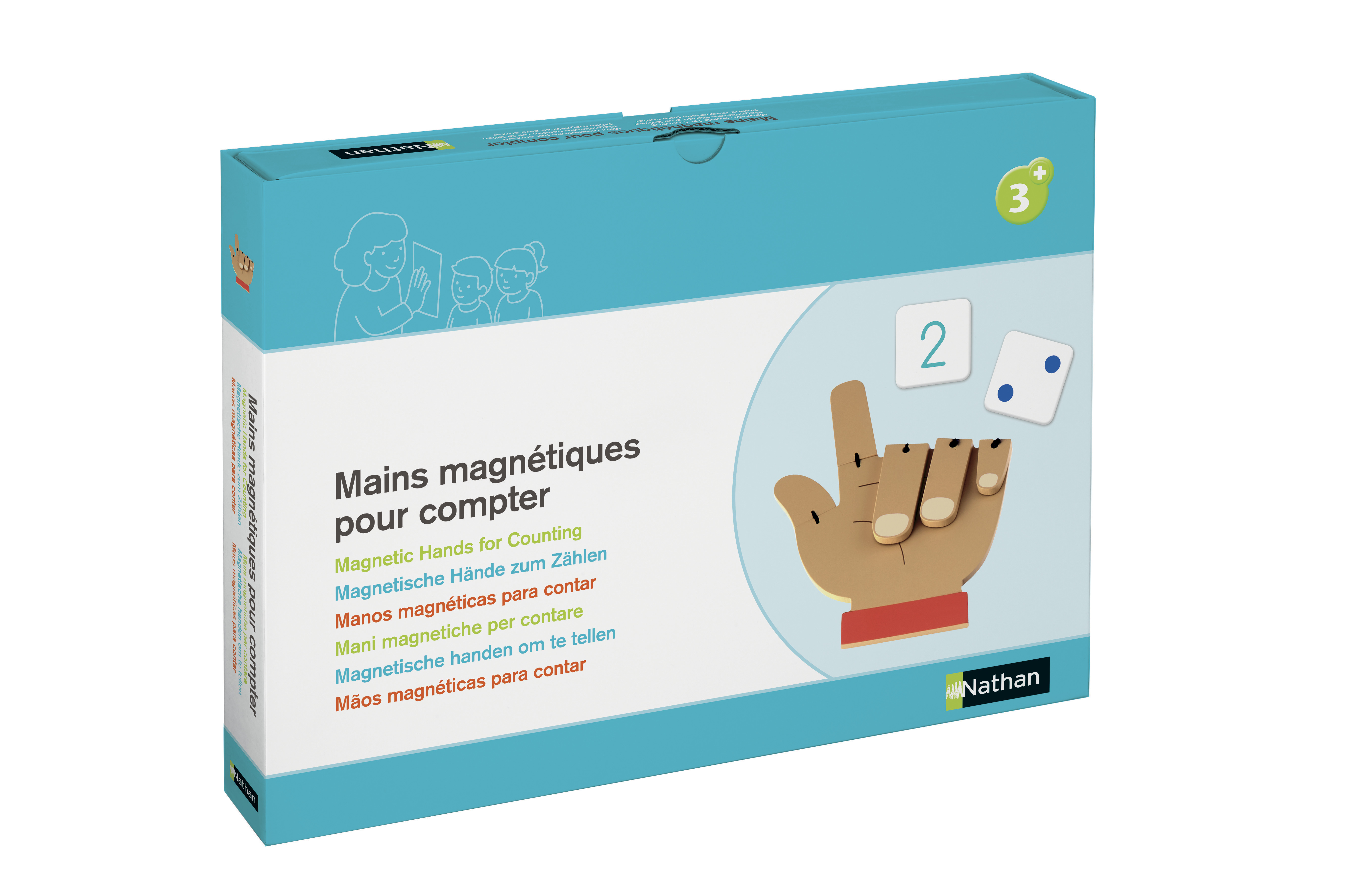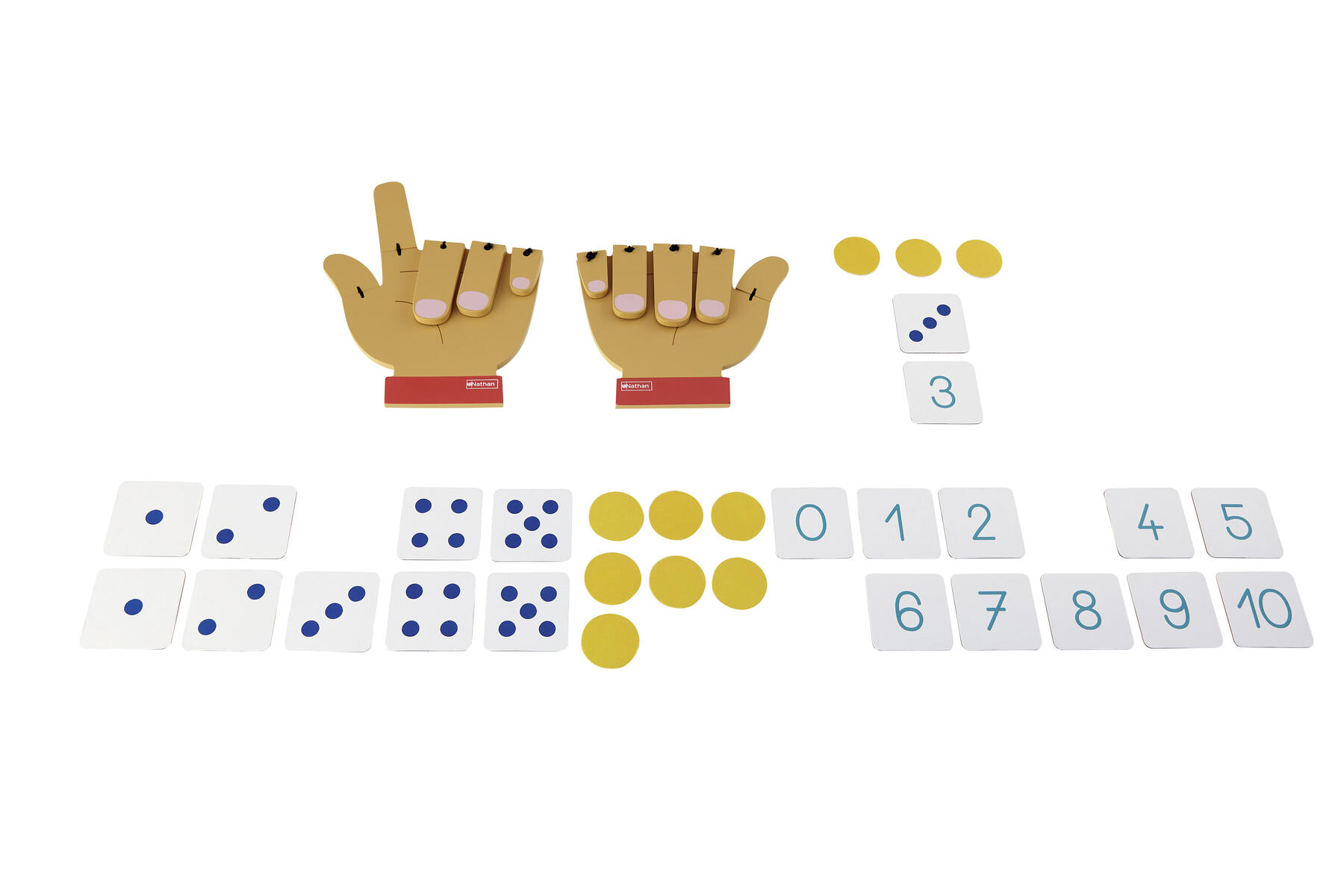 Upptäck siffror och räkning på ett lekfullt sätt med hjälp av magnetiska siffror, prickar och fingrar. Ger övning på fingrar och att räkna på dem, förstå summor, uttrycka små kvantiteter samt att läsa siffror upp till tio. Innehåller 2 magnetiska händer i trä med vikbara fingrar, 32 magnetiska räknare varav 10 runda, 10 tärningar, 11 tal och 1 lärarhandledning. PVC-fri. Från 3 år.