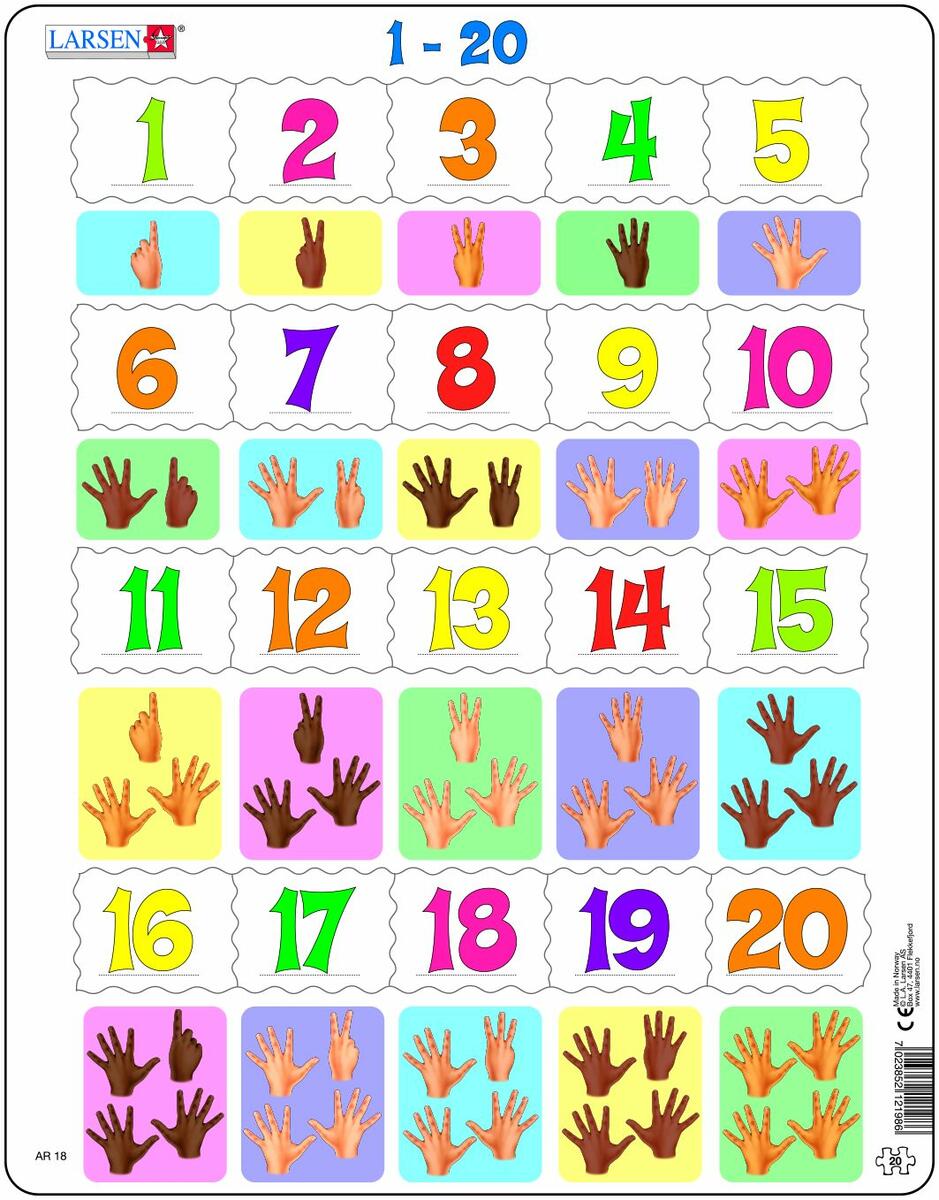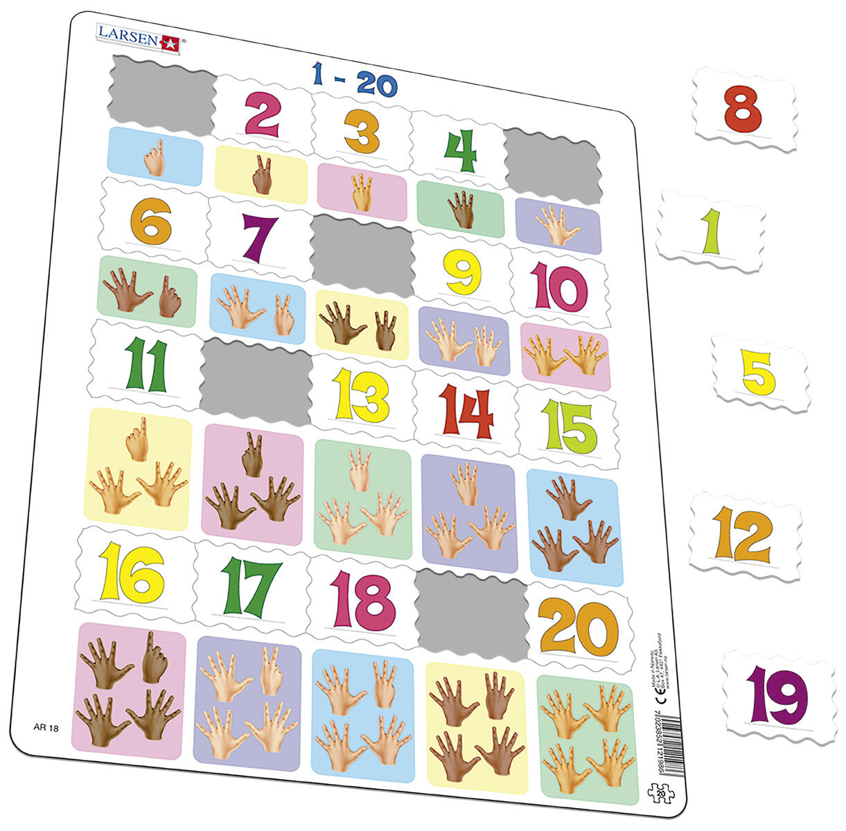 Träna på siffror och antal i talområdet 1–20. Varje pusselbit har en siffra och biten passar endast i luckan ovanför motsvarande antal fingrar. Fingrarna är ett användbart verktyg för alla som behöver lära sig att förstå siffror och antal – och man har dem alltid med sig. Av kraftig FSC-märkt återvunnen kartong. PVC-fri. Från 3 år.
