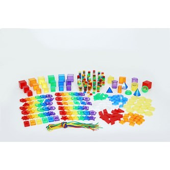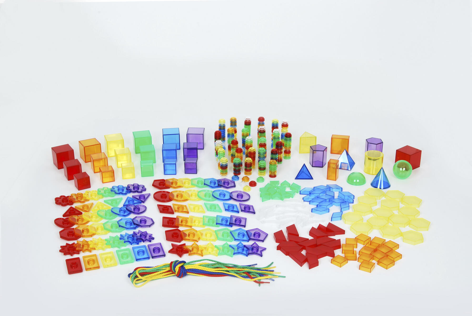 Storlek: Innehåll: 72 st genomskinliga former för snörning i 6 st olika färger (blommor, hexagoner, trianglar, cirklar, hjärtan, romber, oktagoner, fyrkanter, niopunktsstjärnor, pentagoner, rektanglar och fempunktsstjärnor), 90 st genomskinliga blockmönster i 6 st olika färger (hexagoner, trianglar, romber, likformiga och olikformiga fyrhörningar), 12 st genomskinliga kuber i 6 st olika färger (large, medium och small sizes), 12 st genomskinliga geometriska former i 6 st olika färger (sfär, halvsfär, kuber, koner, pyramider, triangulärt prisma, rektangulärt prisma, pentagonalt prisma, hexagonalt prisma), 300 st genomskinliga stapelbara räknare i 6 olika färger, 12 st snören i 4 olika färger.