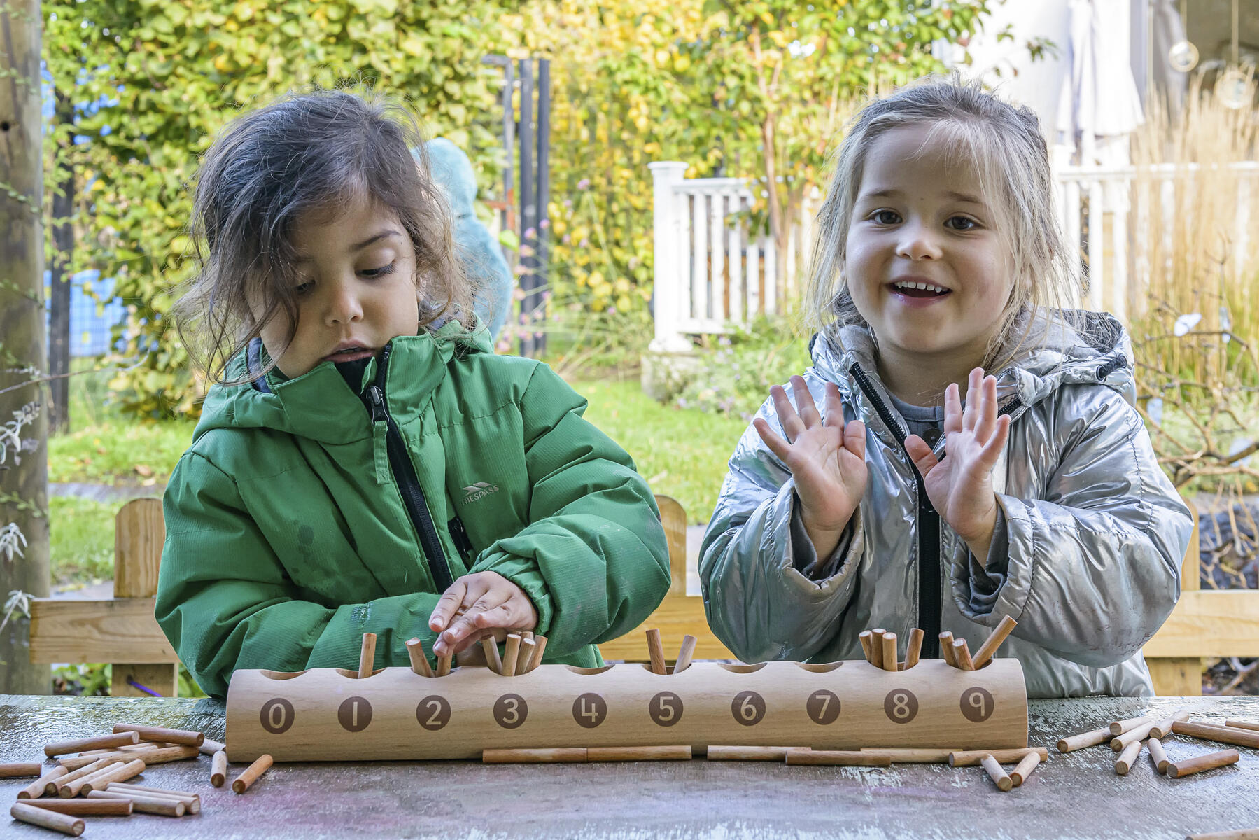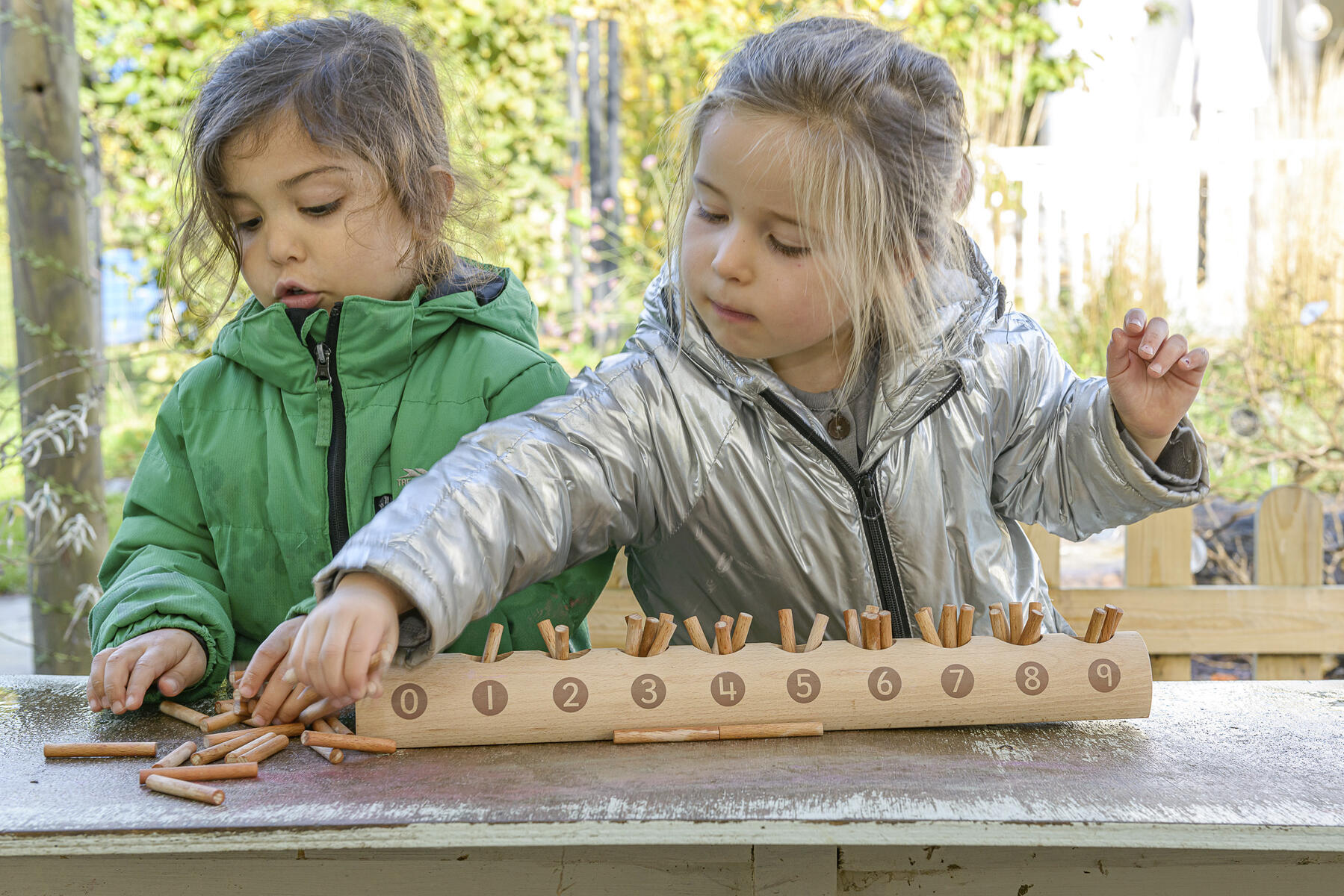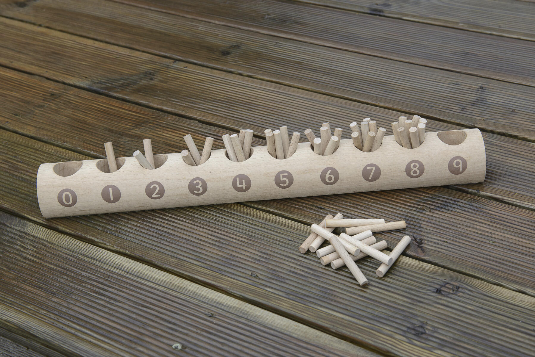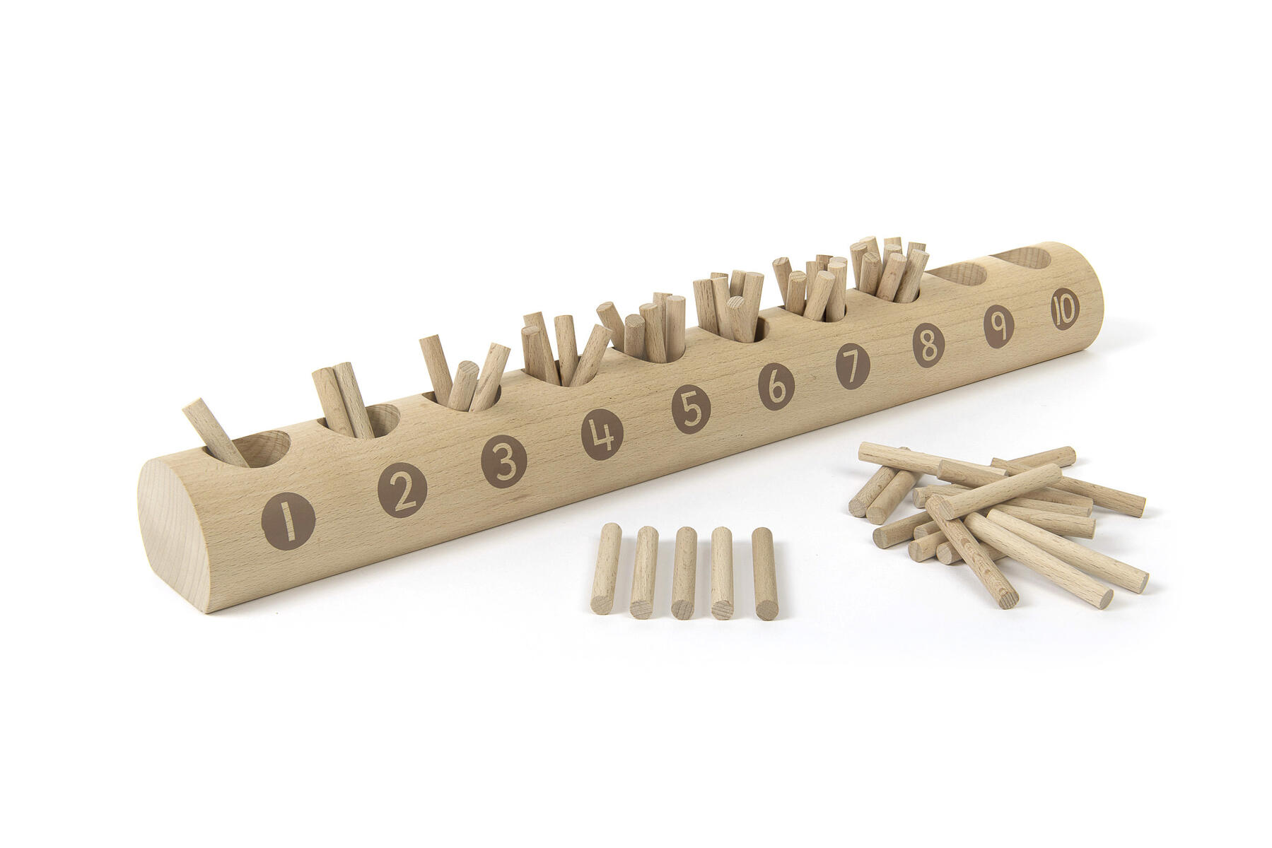 Denna enkla trästock har 10 lika stora hål som är numrerade. Barnen tränar begreppet mängd genom att placera ut rätt antal träpinnar i rätt hål. Antal och mängd tydliggörs enkelt och visuellt. Ena sidan av trästocken är markerad med talen 0-9 och andra sidan med talen 1-10, vilket också gör att värdet för 0 blir tydligt. Innehåller en trästock i FSC-märkt bokträ och 60 trästavar. Mått: trästocken 46 cm, trästavarna 6 cm. PVC-fri.
