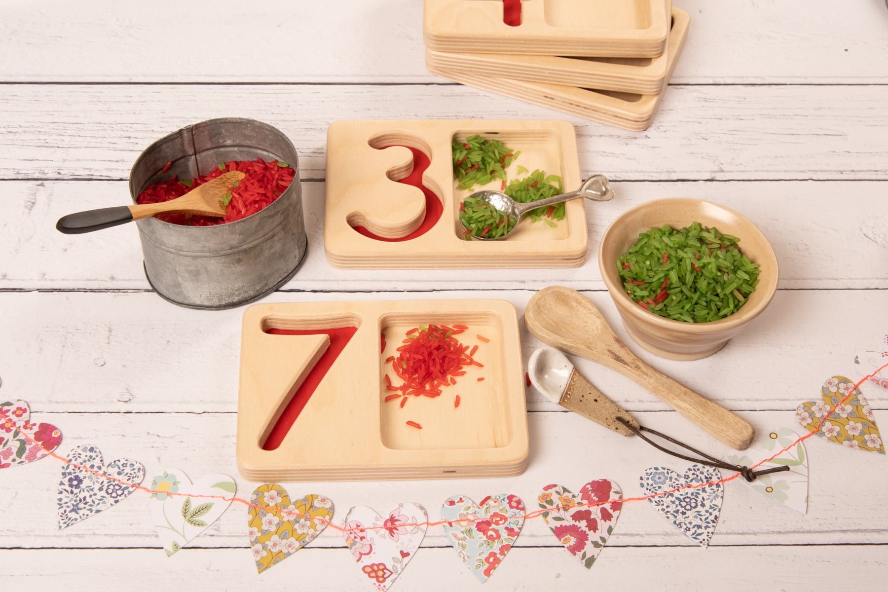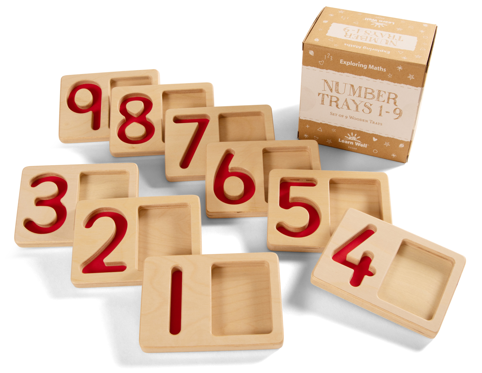 Handgjorda taktila brickor av trä som fördjupar förståelsen av matematik. Idealiska för att utforska räkning, talbindningar och matematiskt språk på mer än och mindre än. Varje bricka mäter 10x14 cm.
