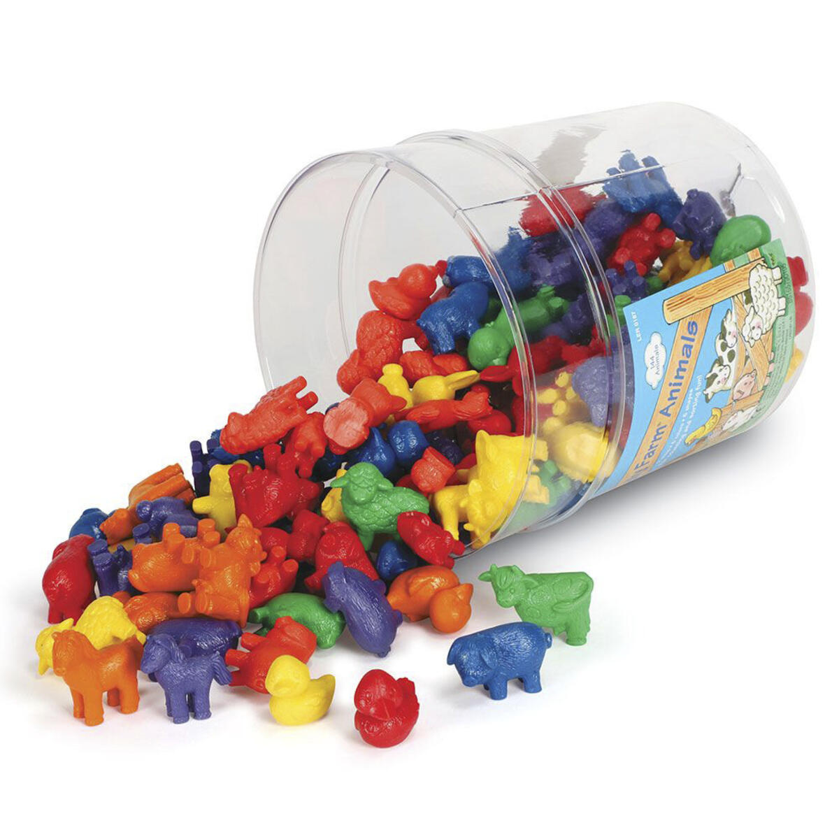 72 bondgårdsdjur i 6 färger för matematikövningar i sortering och klassificering. Mått: ca 4 cm. Av TPR-plast. PVC-fri. Levereras i praktisk burk med lock, av petplast. Från 3 år.