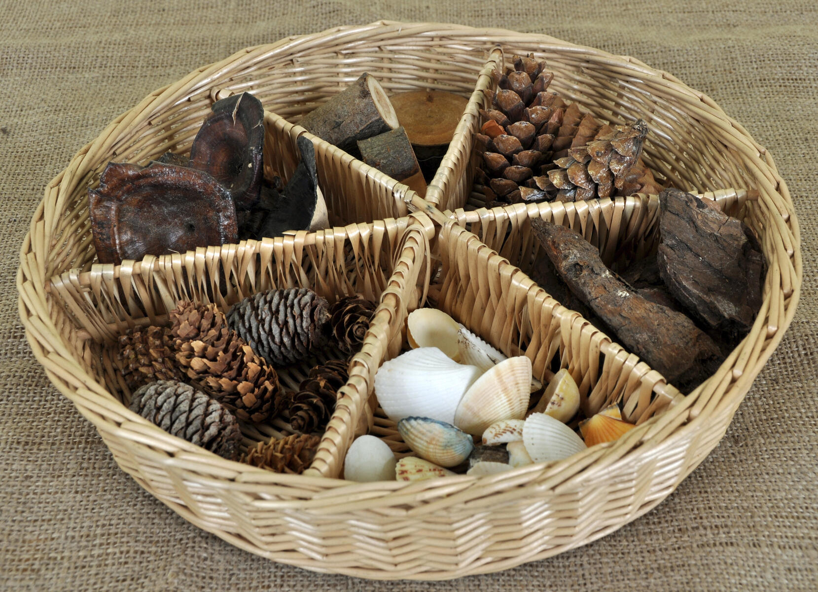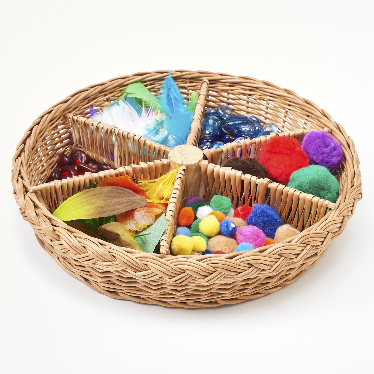 En flätad sorteringskorg som är uppdelad i 6 sektioner. Korgen är idealisk för samlande och sortering, men även för tidig matematik. Perfekt för att utforska och klassificera mindre föremål efter färg och form. För inom- och utomhusbruk. ø 32 cm.