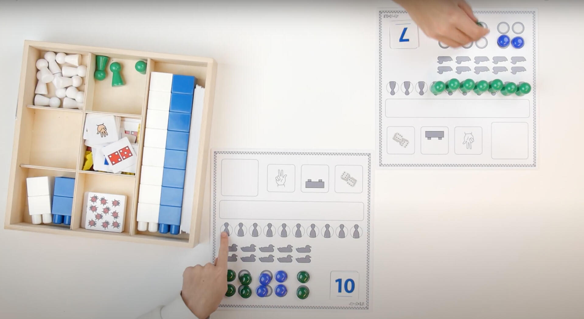 Träna begreppen ”en mer” och ”en mindre” med detta spel. I mitten av varje instruktionskort finns en bild med ett antal. Barnet skall nu placera ett kort som innehåller ”en mer” till höger om bilden och ”en mindre” till vänster. Innehåller 12 stora instruktionskort, 36 små kort samt instruktioner. PVC-fri.