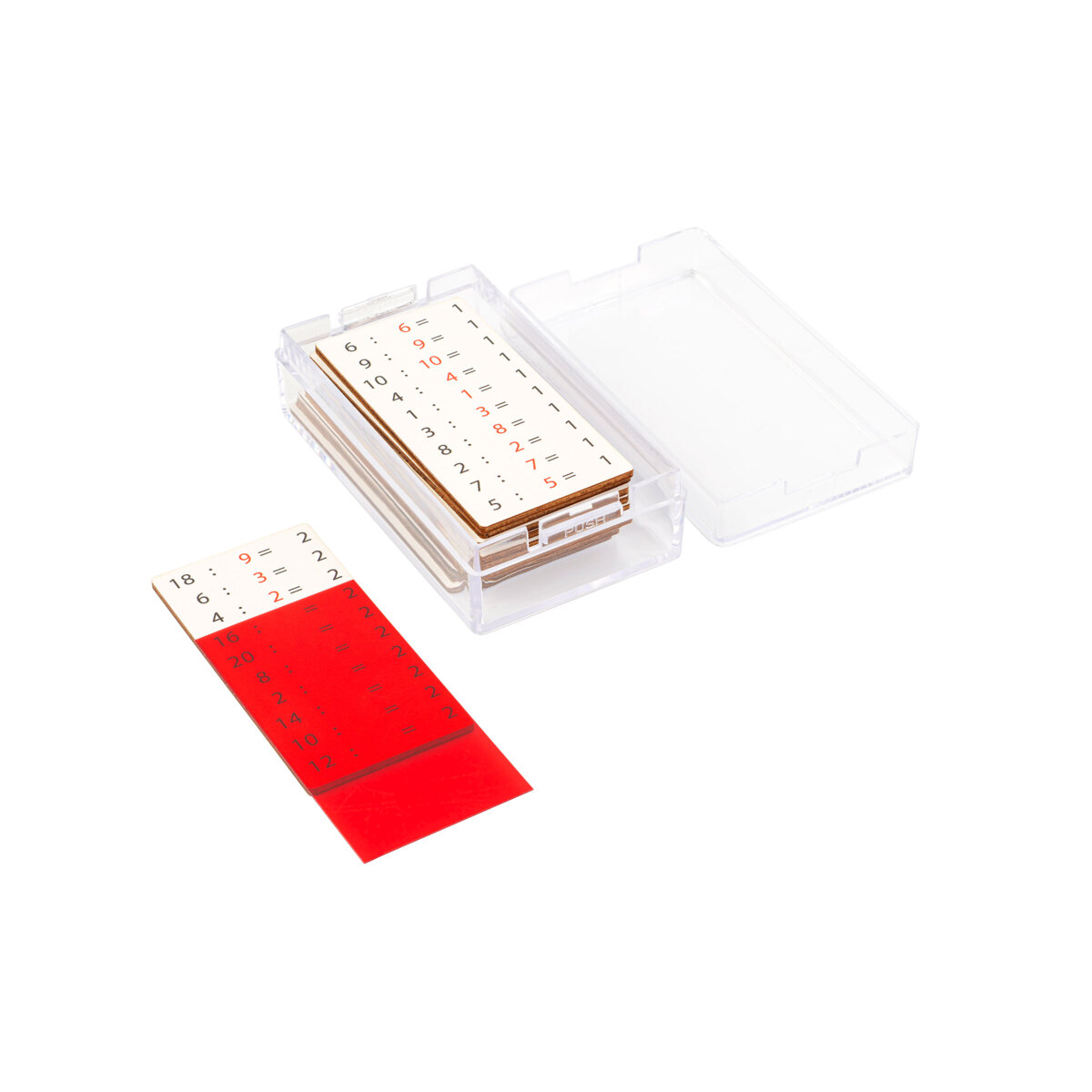 En transparent plastbox med 10 plastkort med divisionsuppgifter från tabellerna 1-10. 3 röda genomskinliga plastkort för att kunna förhöra sig själv. Ena sidan av kortet är tryckt med rätt sekvens medan den andra sidan innehåller blandade uppgifter från samma tabell. Uppgifterna är tryckta i svart och svaren i rött. Placera det röda kortet ovanpå kortet med uppgifterna för att dölja svaren. Mått på boxen: 8x4,5x1.8 cm. Passar från 6 år.