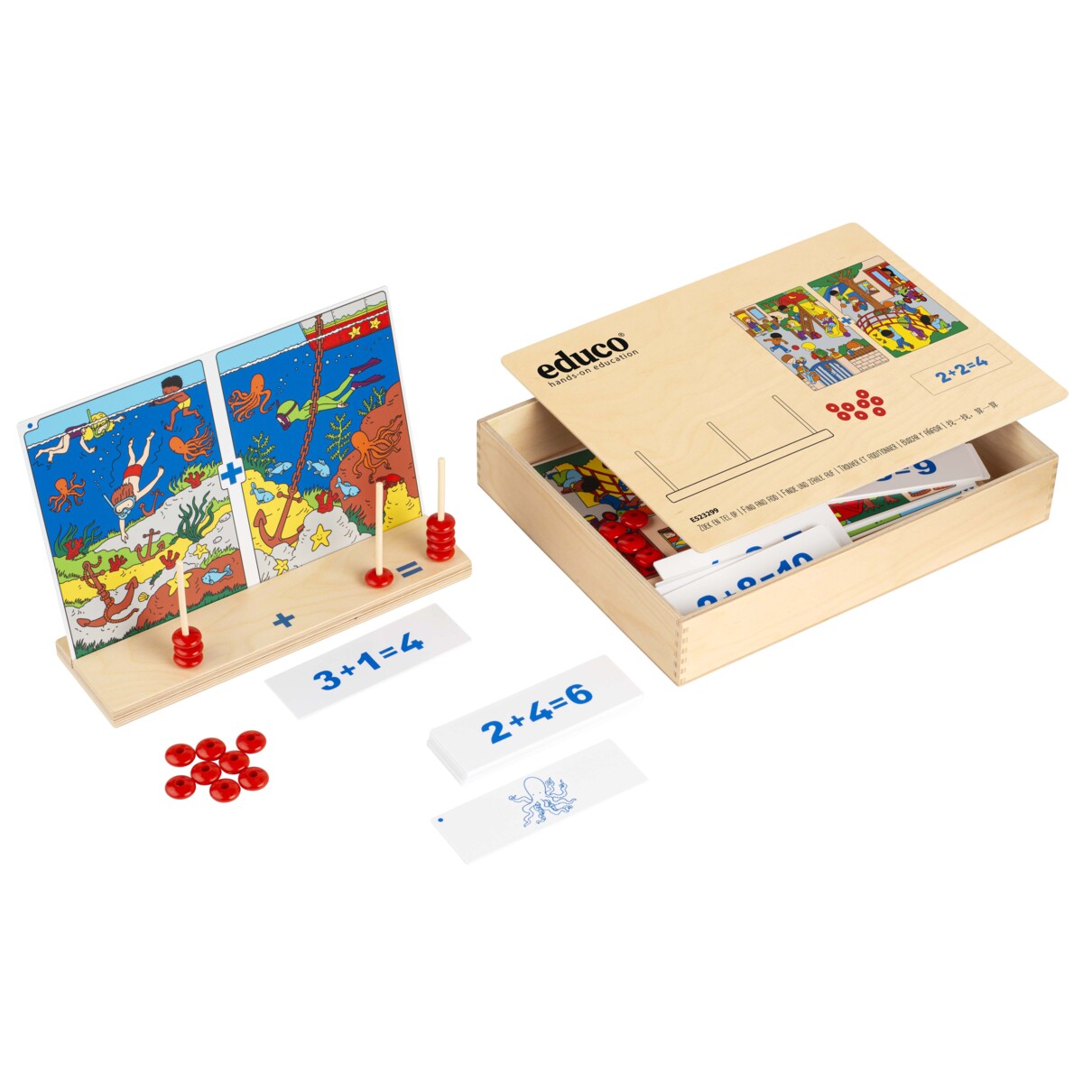 4 temakort i plast, 24 uppgiftsremsor i plast, 60 plastpärlor, 2 ställningar i trä samt trälåda för förvaring. Sök efter uppdragsremsans föremål på temakortet. För varje föremål som hittas på den vänstra bilden placeras en pärla på den första staven. Titta sedan på den högra bilden, räkna ihop föremål och trä på det antalet pärlor på den andra staven. På den tredje staven sätter du det totala antalet pärlor. Vänd uppdragsremsan för att se svaren visade i siffror. Materialet stimulerar räkning och taluppfattning upp till 10 på ett konkret och roligt sätt. Mått trälåda: 33,5x22,5x7 cm. Från 4 år.