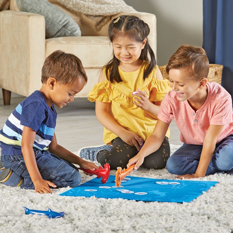 Ett roligt och spännande spel där man övar på additon och subtraktion i klassrummet. Dra ett kort och använd sen din hammarhaj för att plocka upp de sifferkort du behöver för att skapa ditt tal. 2-4 spelare. Från 5 år.