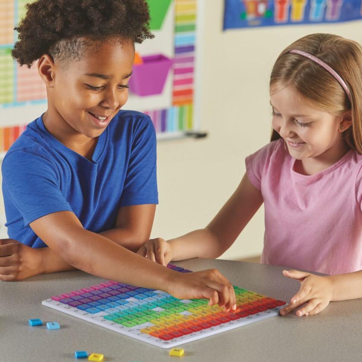 Bräde i trä med 100 små hål till pärlorna, 100 röda pärlor med tillhörande plastask och lock, kort med siffrorna 1–10 med tillhörande plastask och lock, en röd marker. Tränar multiplikation från 1x1 till 10x10. På ett konkret sätt ges en tydlig förståelse för vad multiplikation är när ett visst antal pärlor läggs upp rätt antal gånger. Talmönster visas och hantering av pärlorna tränar även upp finmotorik och koncentration. Från 5 år.
